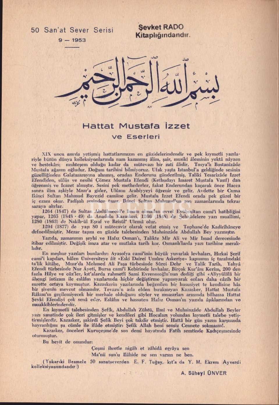 50 Sanat Sever Serisi´nin 1953 senesi "HATTAT KAZASKER MUSTAFA İZZET HAYATI VE ESERLERİ" başlıklı 9. sayısı, A. S. Ünver, 2 sayfa, 18x25 cm...