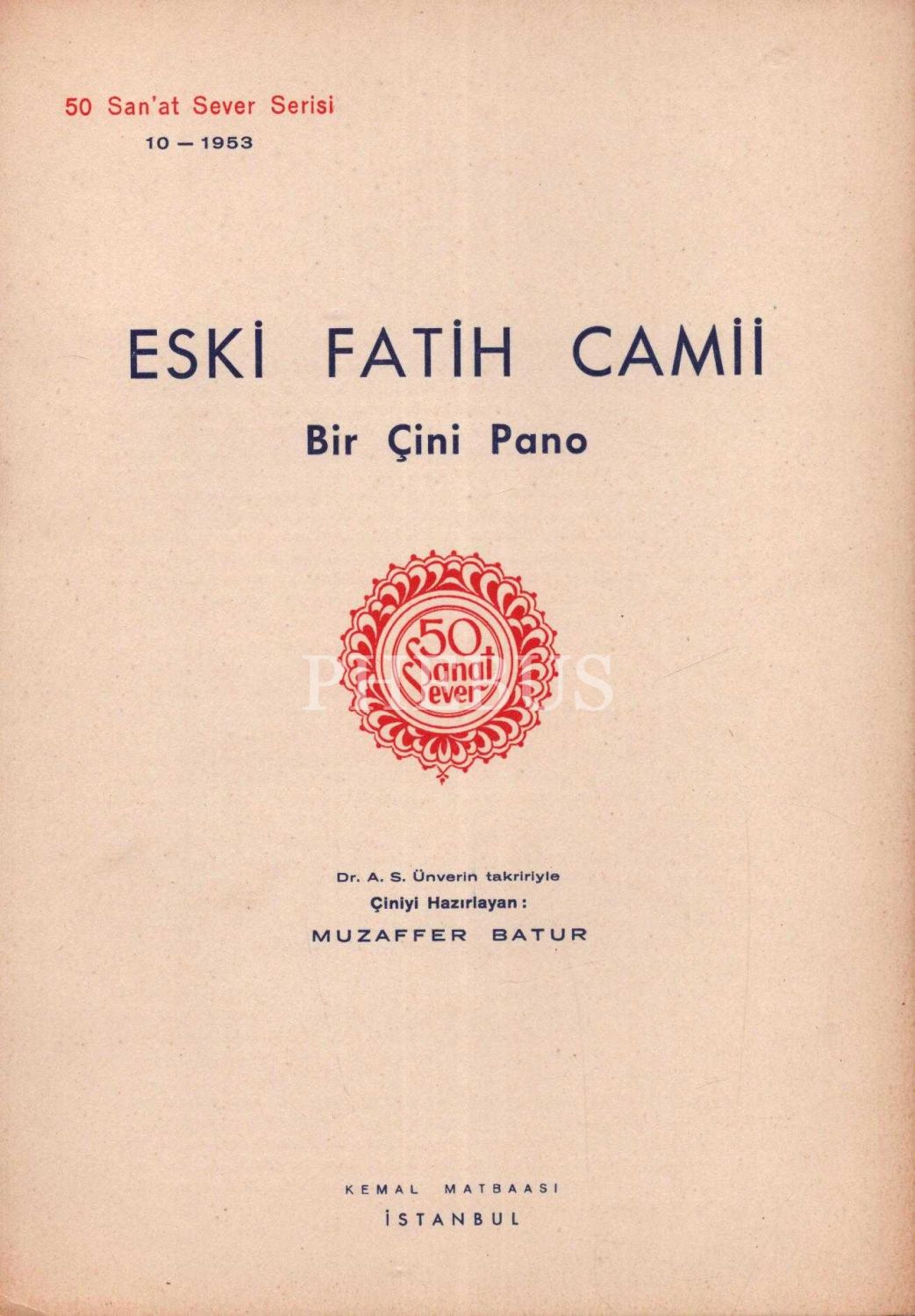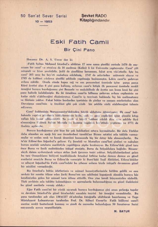 50 Sanat Sever Serisi´nin 1953 senesi "ESKİ FATİH CAMİ BİR ÇİNİ PANO" başlıklı 10. sayısı, A. S. Ünver, çiniyi hazırlayan:Muzaffer Batur, 2 sayfa, 18x25 cm...