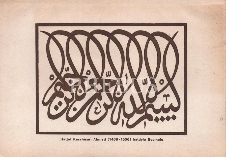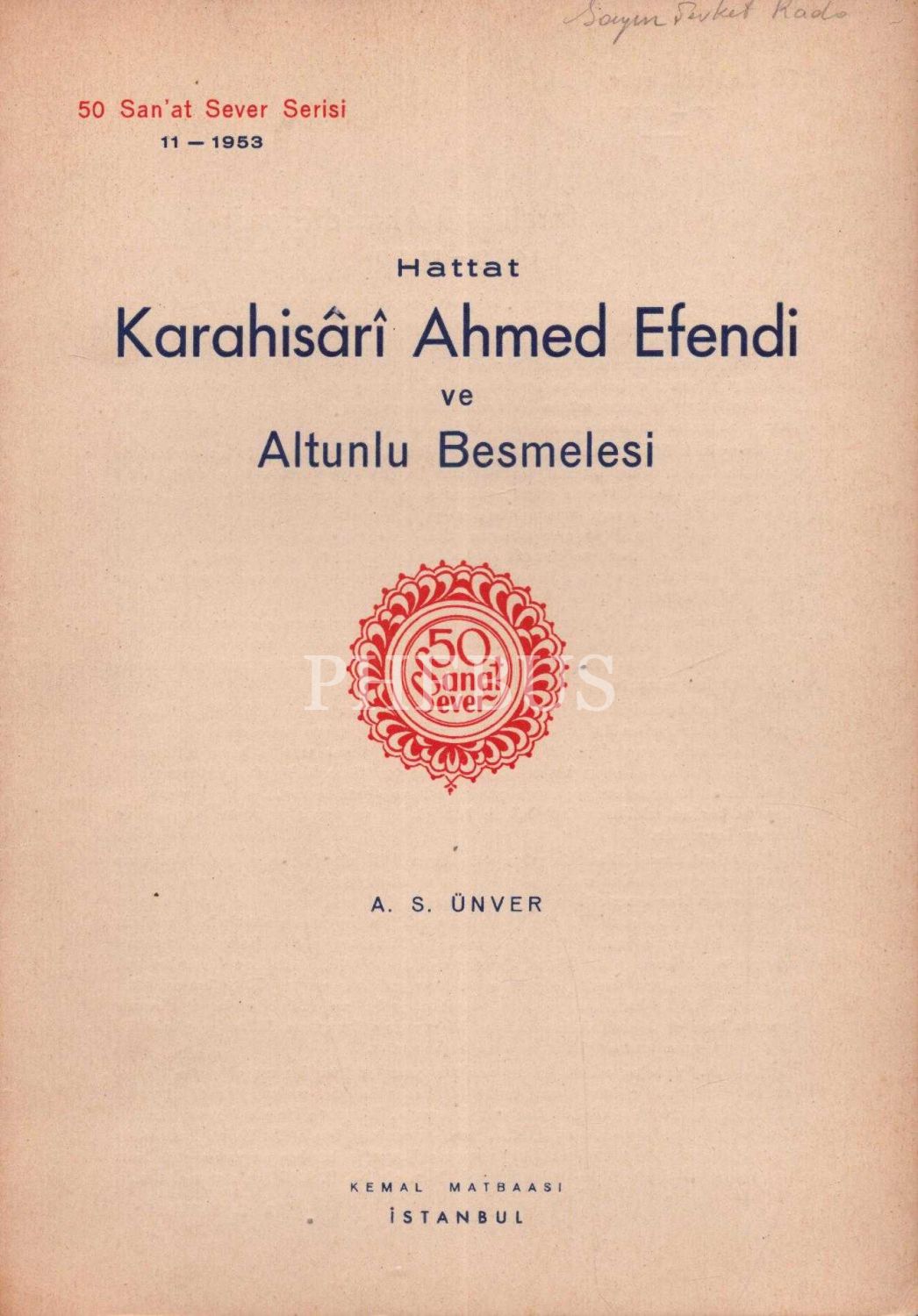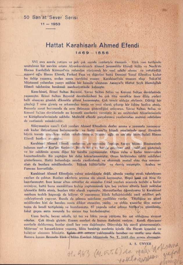 50 Sanat Sever Serisi´nin 1953 senesi "HATTAT KARAHİSARİ AHMED EFENDİ VE ALTUNLU BESMELESİ" başlıklı 11. sayısı, A. S. Ünver, 2 sayfa, 18x25 cm...