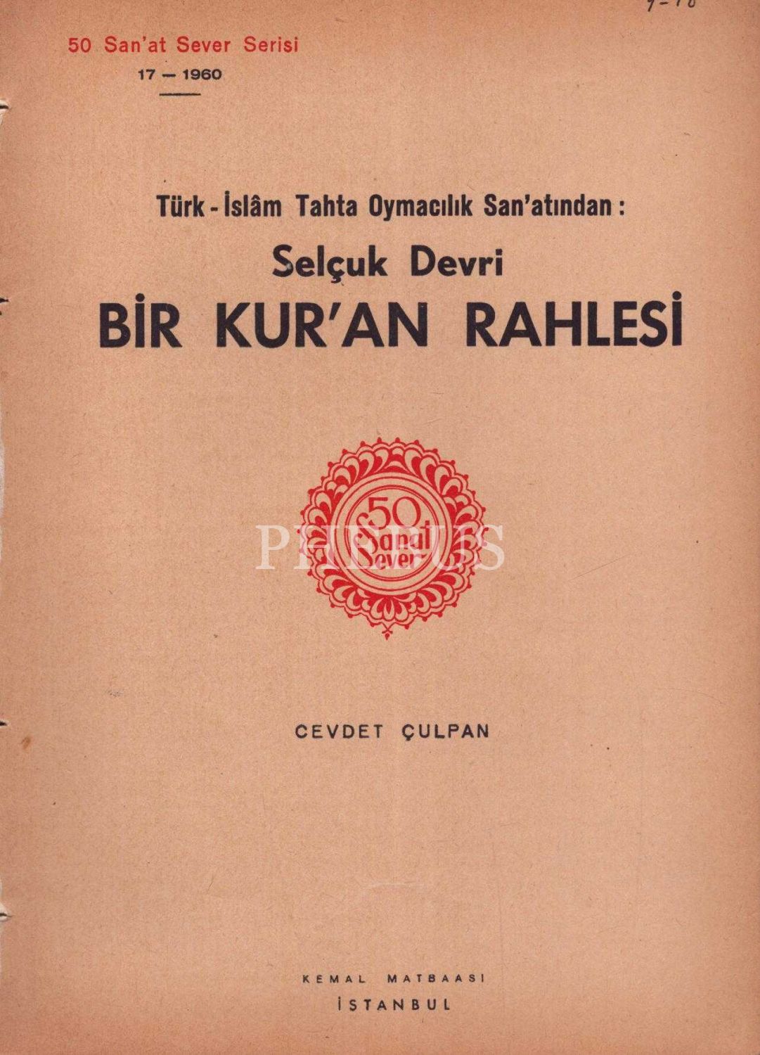 50 Sanat Sever Serisi´nin 1960 senesi "TÜRK -İSLAM TAHTA OYMACILIK SAN´ATINDAN: SELÇUK DEVRİ BİR KURA´N RAHLESİ" başlıklı 17. sayısı, Cevdet Çulpan, 2 sayfa, 18x25 cm...