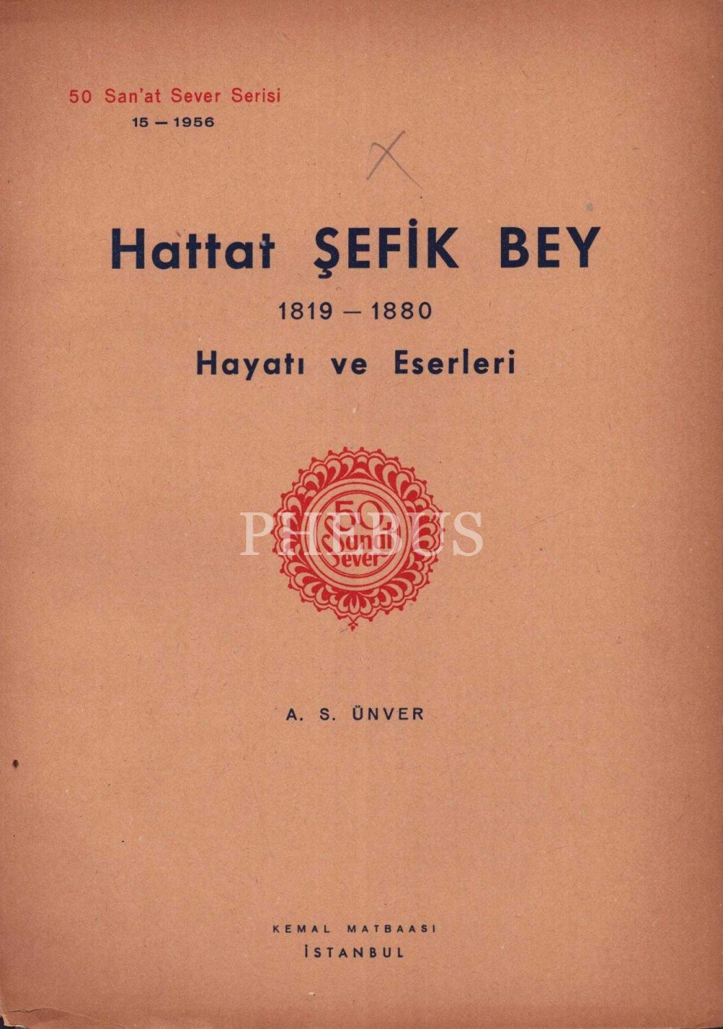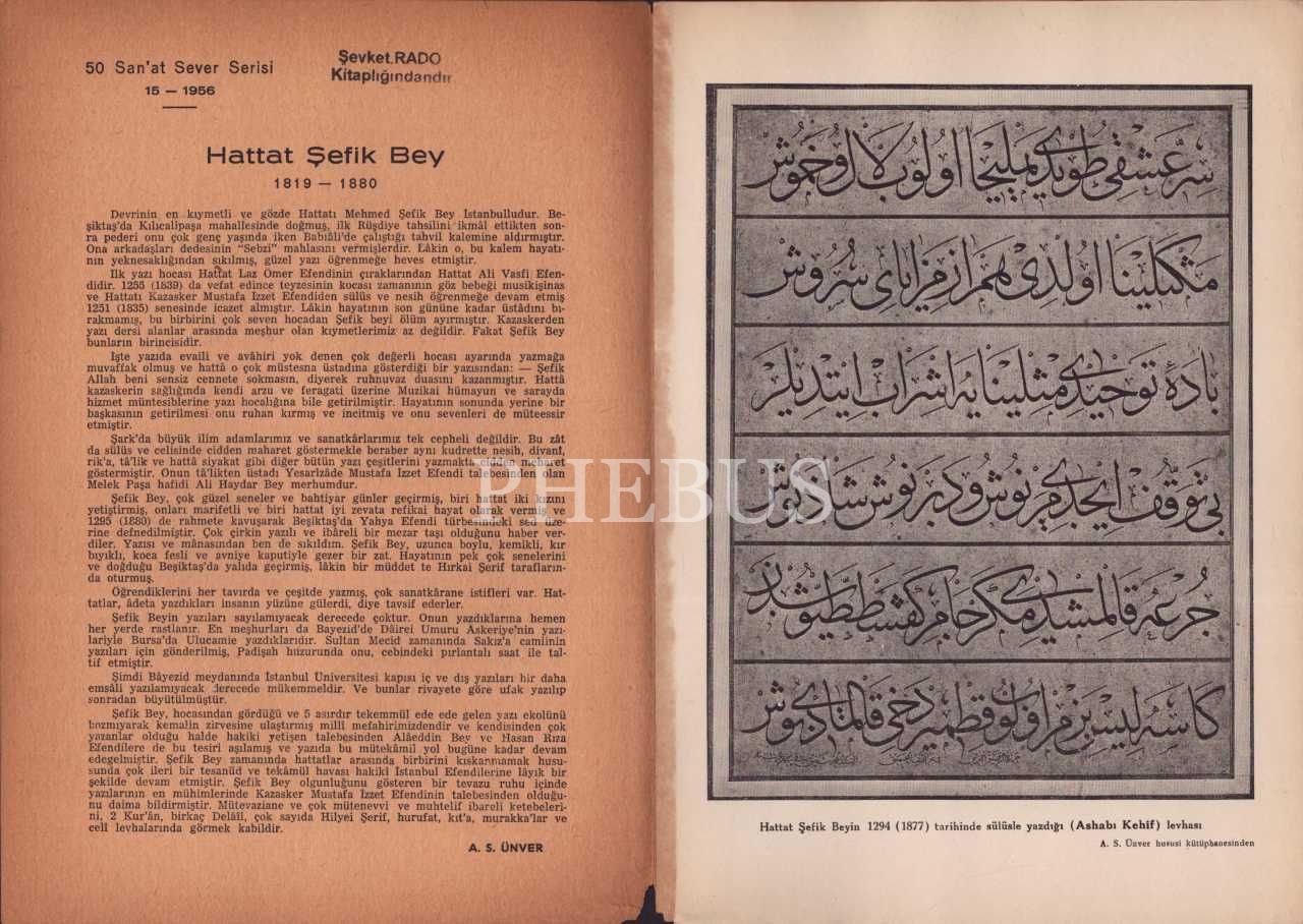 50 Sanat Sever Serisi´nin 1956 senesi "HATTAT ŞEFİK BEY HAYATI VE ESERLERİ" başlıklı 15. sayısı, A. S. Ünver, 2 sayfa, 18x25 cm...