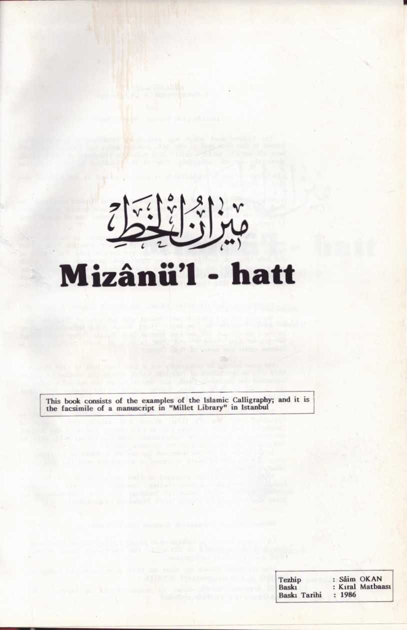 MİZÂNÜ´L- HATT, Hakkâk-zâde Mustafa Hilmi Efendi, hazırlayan: Abdülkadir Dedeoğlu, 1986, Osmanlı Yayınevi, 152 sayfa, 24x35 cm...