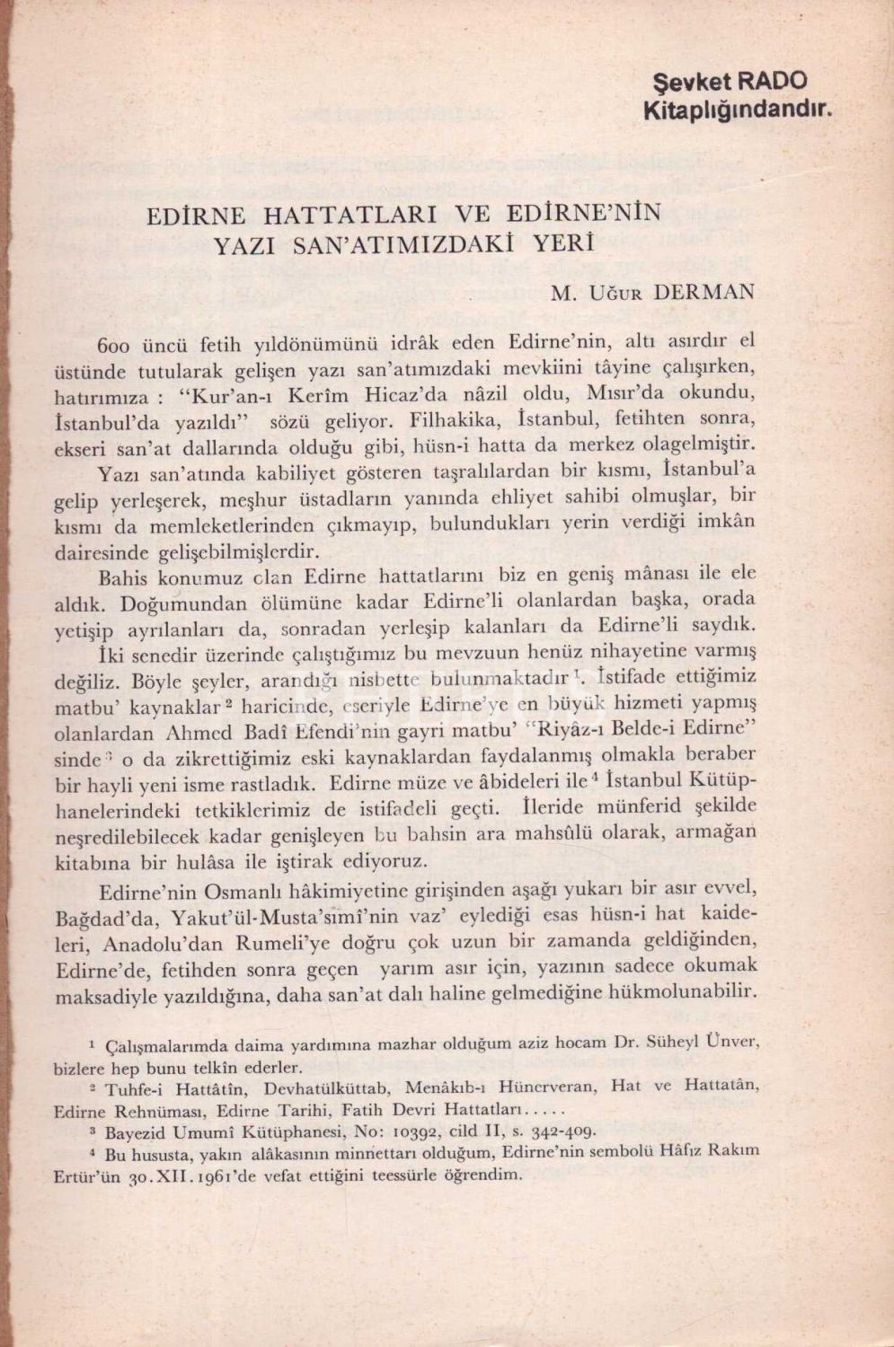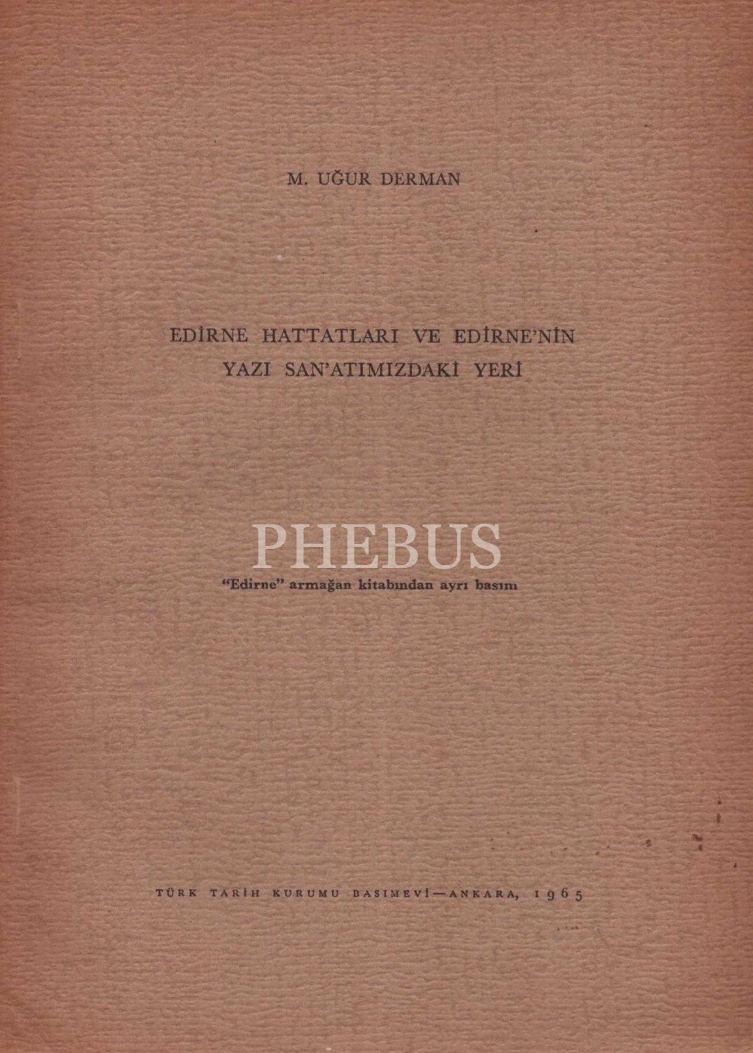 EDİRNE HATTATLARI VE EDİRNE´NİN YAZI SANATIMIZDAKİ YERİ, M. Uğur Derman, 1965, Türk Tarih Kurumu Basımevi, 20 sayfa, 17x24 cm...