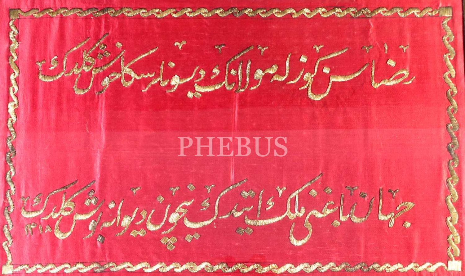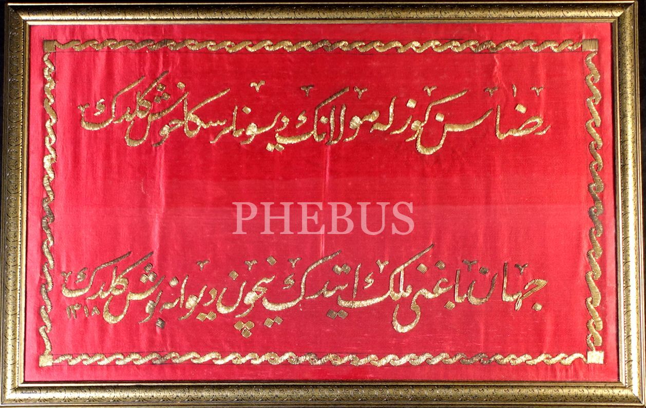 1318 tarihli kırmızı bez üzerine altın rengi harflerle işlenmiş beyit, 75x50 cm...