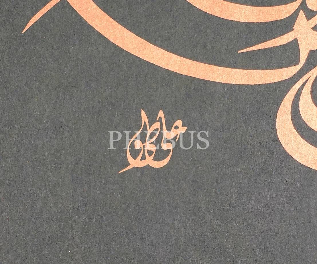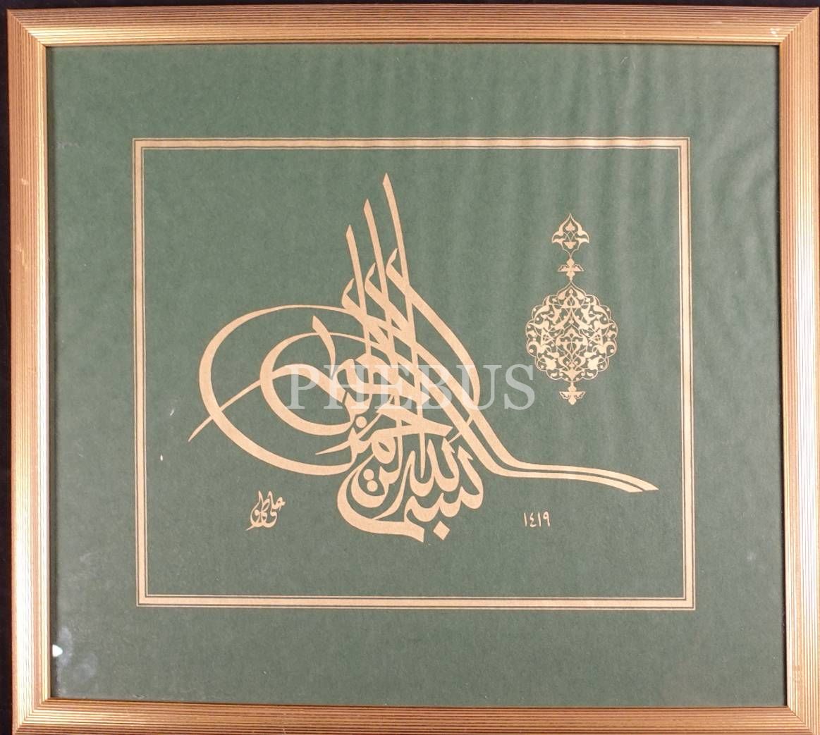 Ali Toy hattıyla tuğra formunda özgün baskı besmele, 1419 tarihli, 42x37 cm...