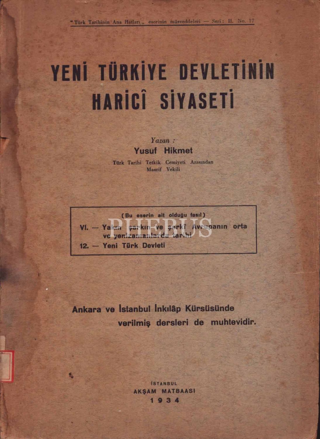 YENİ TÜRKİYE DEVLETİNİN HARİCÎ SİYASETİ, Yusuf Hikmet, İstanbul 1934, Akşam Matbaası, 162 sayfa...
