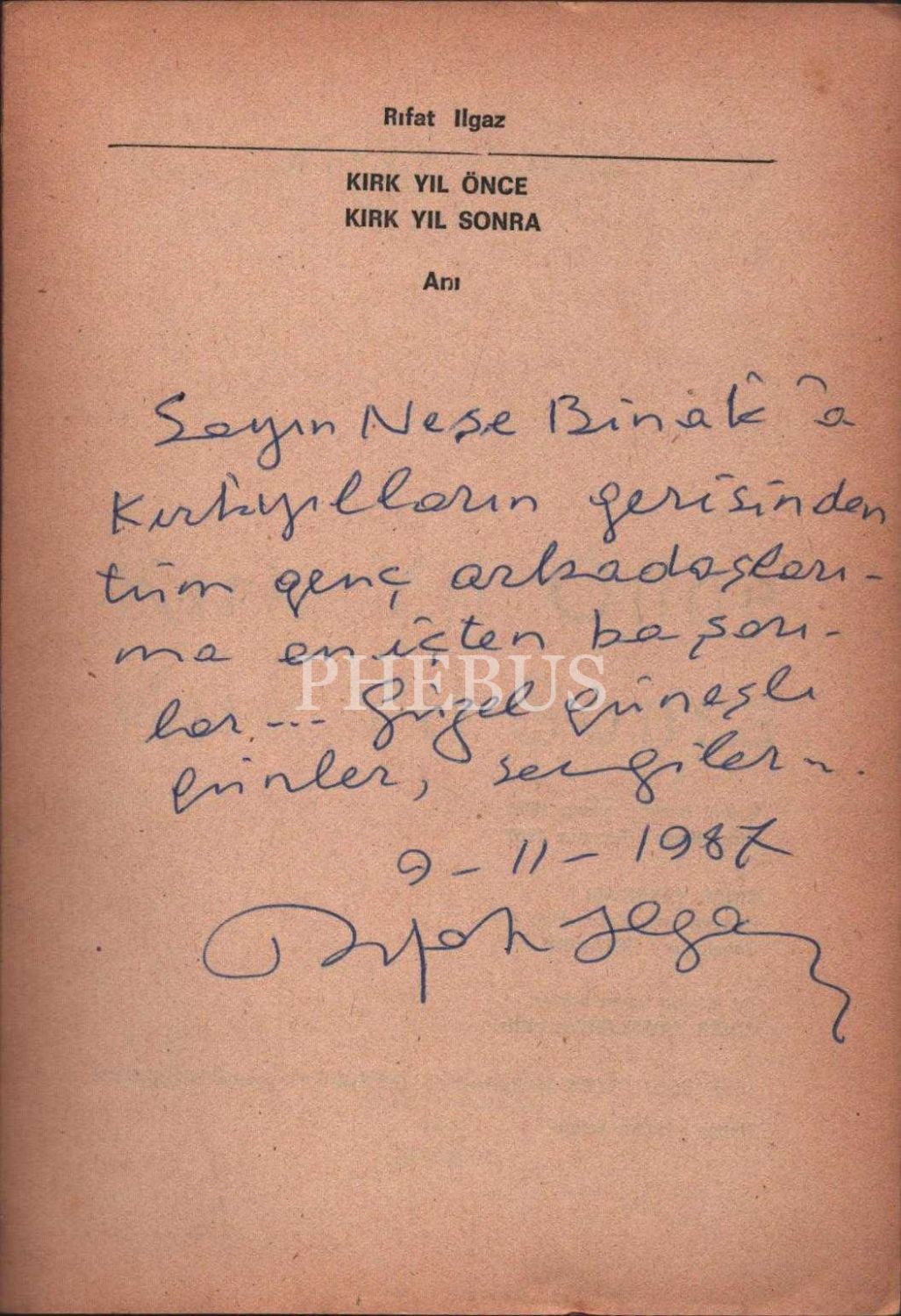 KIRK YIL ÖNCE KIRK YIL SONRA (Anı), Rıfat Ilgaz, 1987, Çınar Yayınları, 119 sayfa, 14x20 cm, İTHAFLI VE İMZALI...