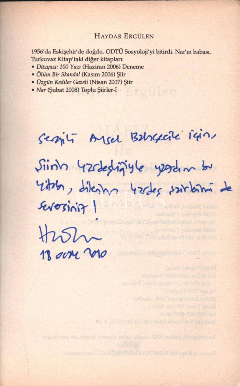 HAFIZ İLE SEMENDER, Haydar Ergülen, 2008, Turkuvaz Kitap, 265 sayfa, 13x20 cm, İTHAFLI VE İMZALI...