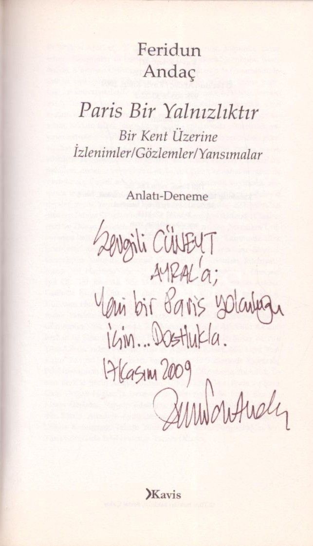 İthaf, " Sevgili Cüneyt Ayral´a; Yeni bir Paris yolculuğu için... Dostlukla. 17 Kasım 2009" şeklindedir.