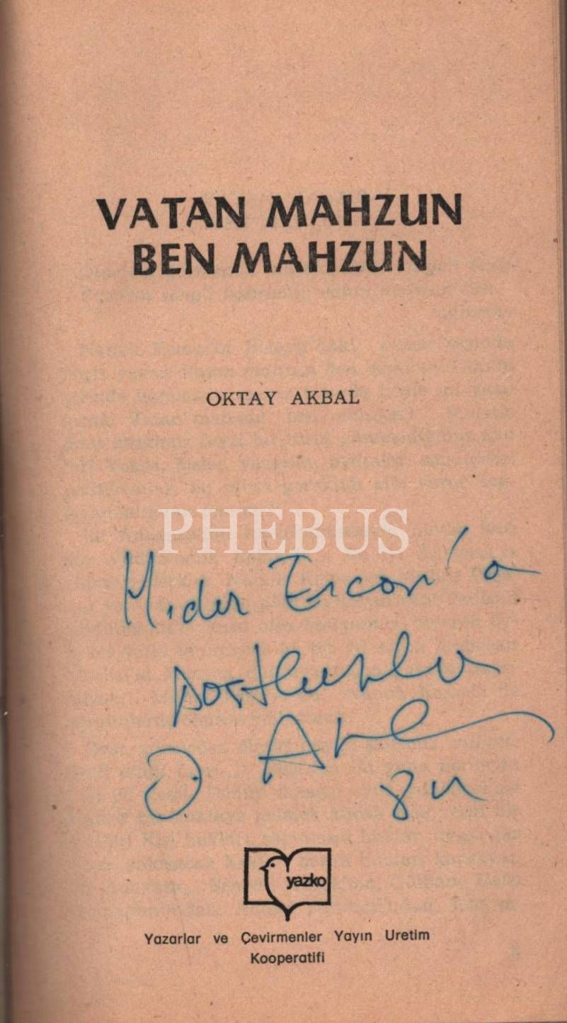 VATAN MAHZUN BEN MAHZUN, Oktay Akbal, 1983, YAZKO, 132 sayfa, 11x20 cm, İTHAFLI VE İMZALI...