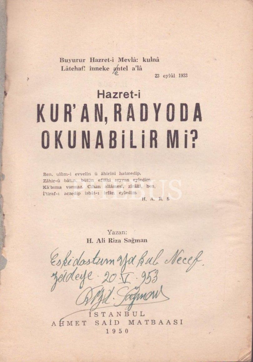 HZ. KUR´AN RADYODA OKUNABİLİR Mİ? , H. Ali Rıza Sağman, 1950, Ahmed Said Matbaası, 204 sayfa, 14x20 cm, İTHAFLI VE İMZALI...