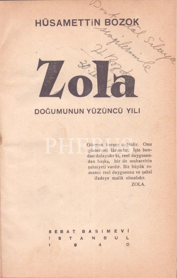 ZOLA´NIN DOĞUMUNUN YÜZÜNCÜ YILI, Hüsamettin Bozok, 1940, Sebat Basımevi, 47 sayfa, 14x20 cm, İTHAFLI VE İMZALI...