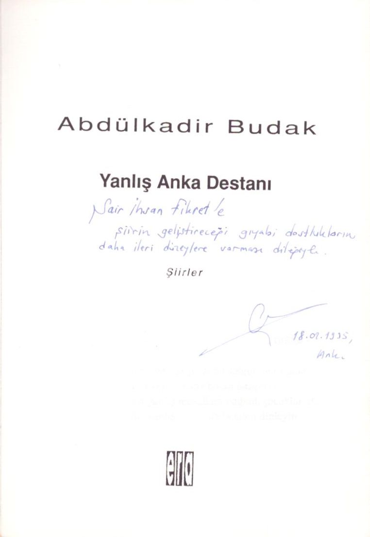 İthaf, " Şair İhsan Fikret´e şiirin geliştireceği gıyabi dostlukların daha ileri düzeylere varması dileğiyle. 18.02.1995 Ank." şeklindedir.