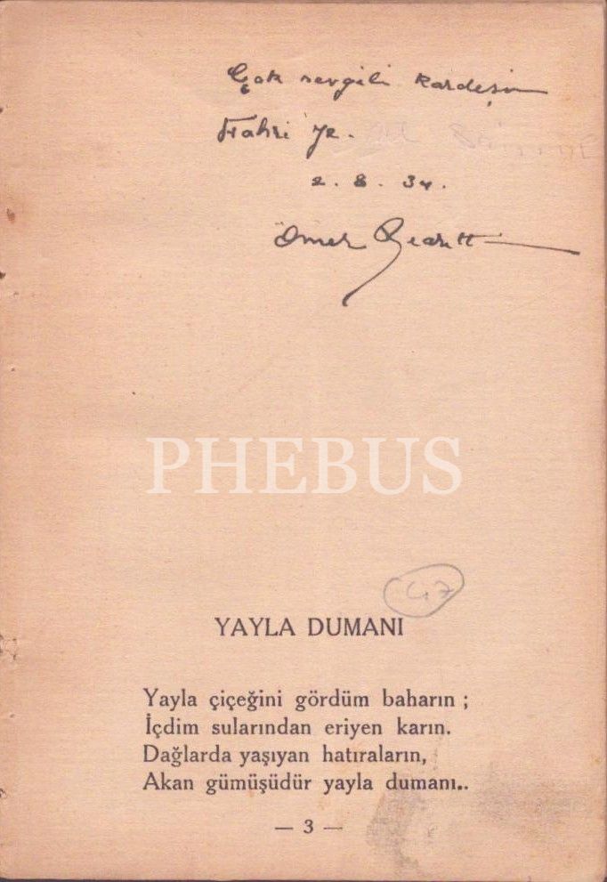 YAYLA DUMANI, Ömer Bedrettin, 1934, Türkiye Matbaası, 62 sayfa, 12x17 cm, İTHAFLI VE İMZALI...