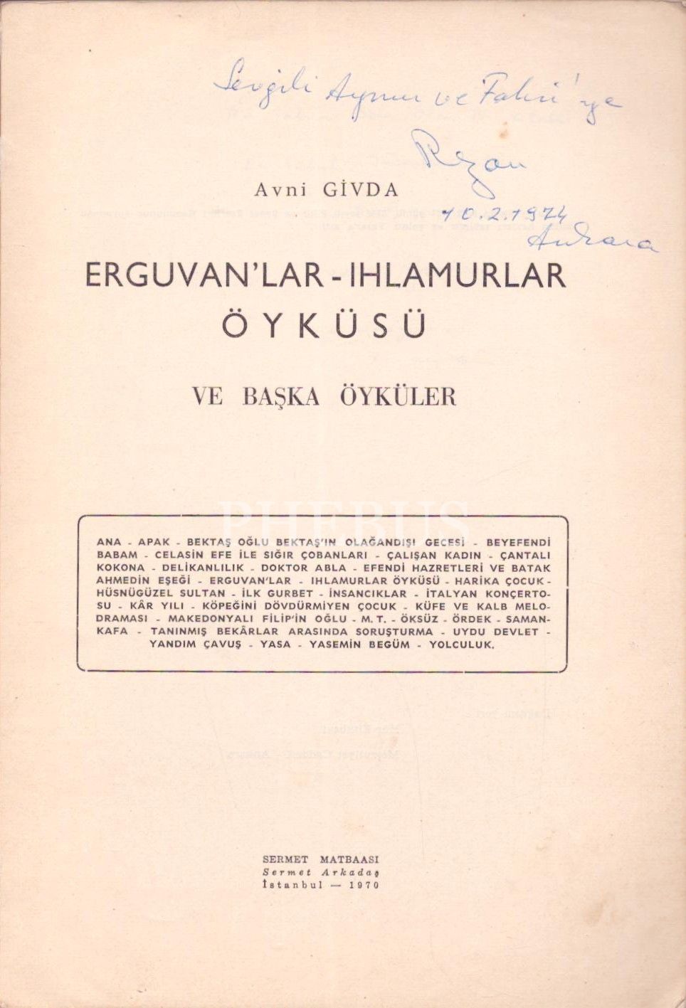 ERGUVAN´LAR-IHLAMURLAR ÖYKÜSÜ VE BAŞKA ÖYKÜLER, Avni Givda, 1970, Sermet Matbaası, 358 sayfa, 17x25 cm, İTHAFLI VE İMZALI...