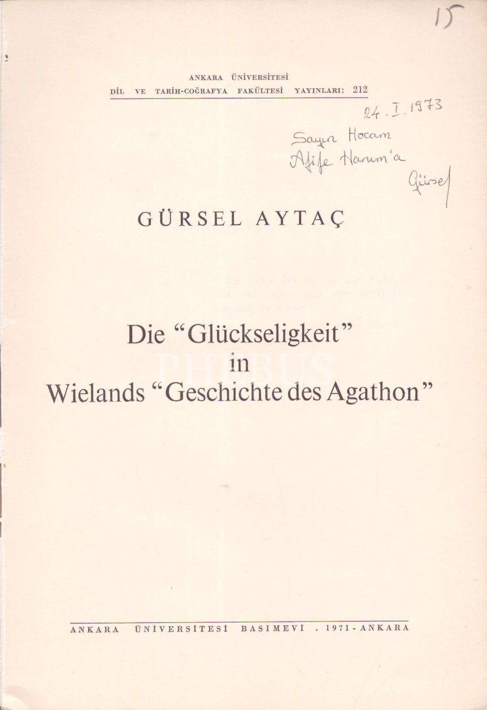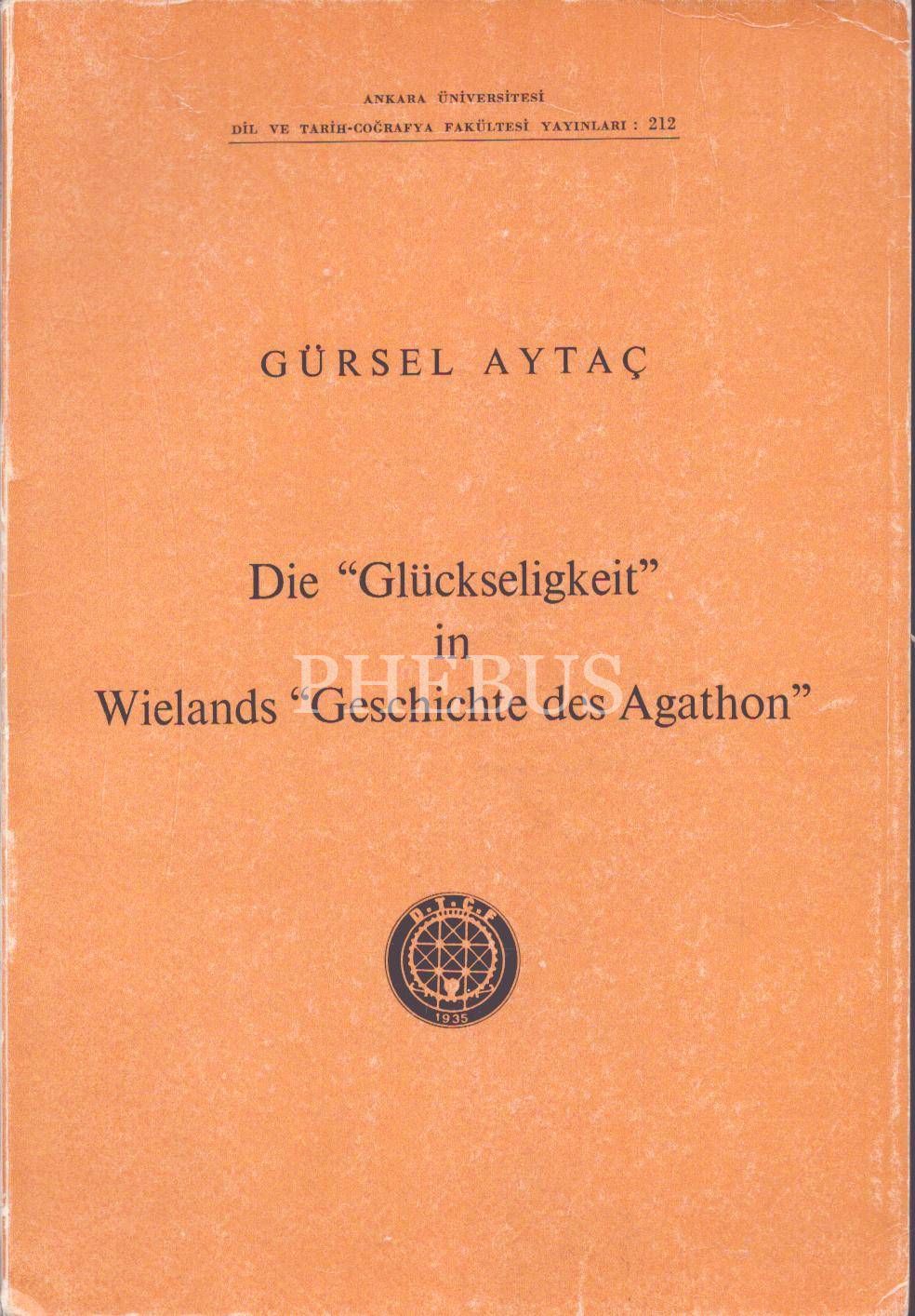 ALMANCA: DIE "GLÜCKSELIGKEIT" IN WIELANDS "GESCHICHTE DES AGATHON", Gürsel Aytaç, 1971, Ankara Üniversitesi Basımevi,138 sayfa, 17x24 cm, İTHAFLI VE İMZALI...