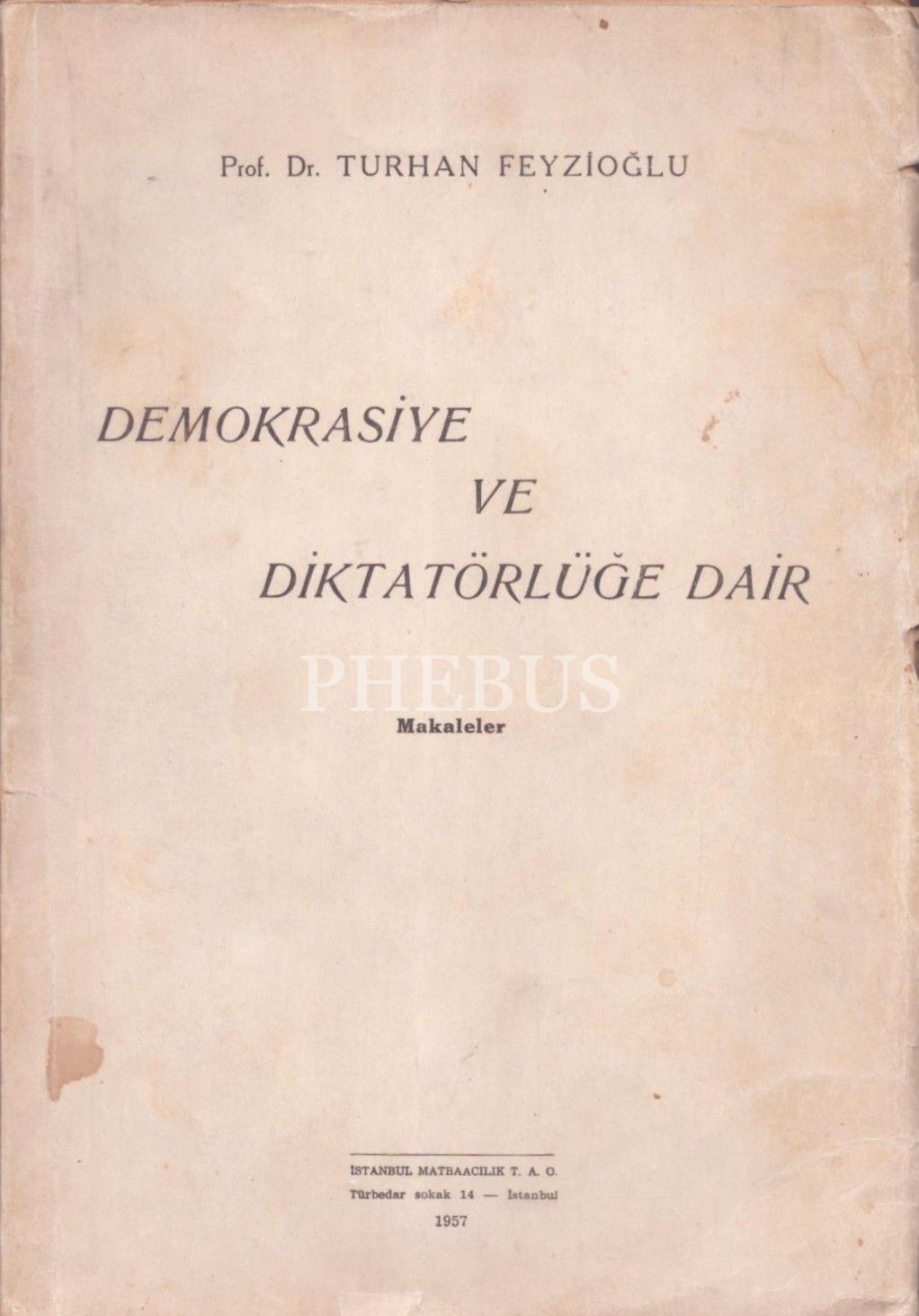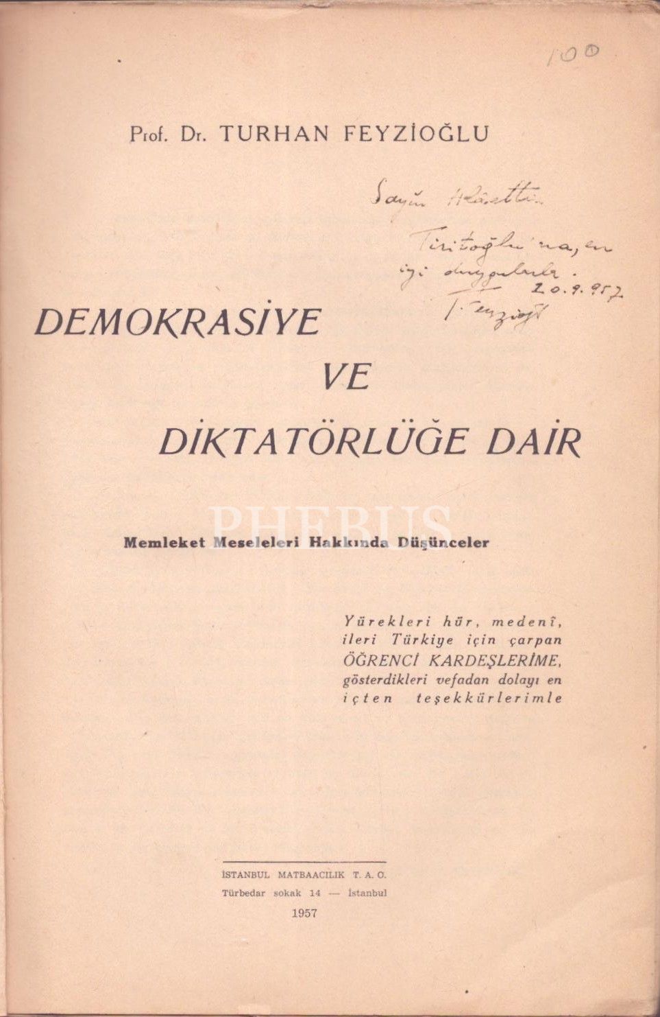 DEMOKRASİYE VE DİKTATÖRLÜĞE DAİR, Turhan Feyzioğlu, 1957, İstanbul Matbaacılık T.A.O, 210 sayfa, 18x25 cm, İTHAFLI VE İMZALI...