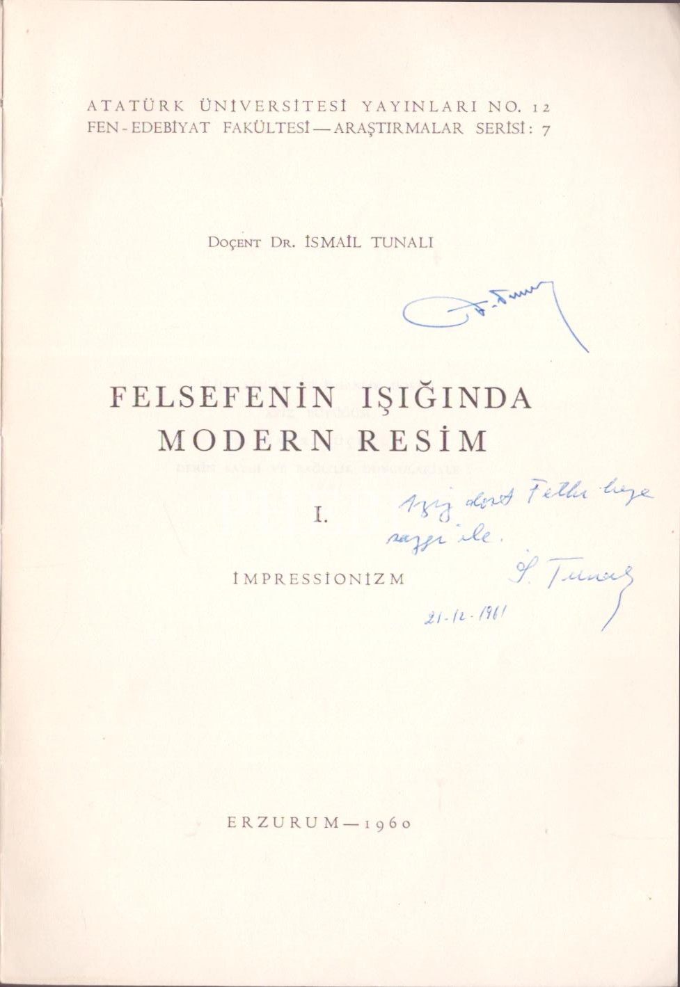 FELSEFENİN IŞIĞINDA MODERN RESİM I. IMPRESSİONİZM, İsmail Tunalı, 1960, Atatürk Üniversitesi Yayınları, 114 sayfa, 17x25 cm, İTHAFLI VE İMZALI...