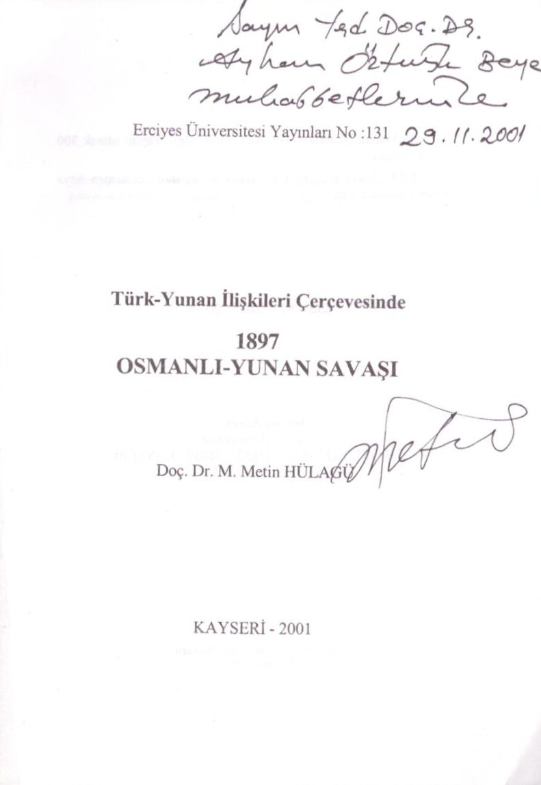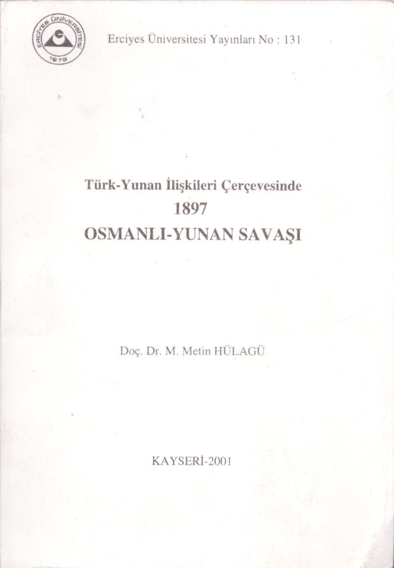 TÜRK-YUNAN İLİŞKİLERİ ÇERÇEVESİNDE 1897 OSMANLI-YUNAN SAVAŞI, M. Metin Hülagü, Kayseri 2001, Erciyes Üniversitesi Yayınları, 380 sayfa, 14x20 cm, İTHAFLI VE İMZALI...