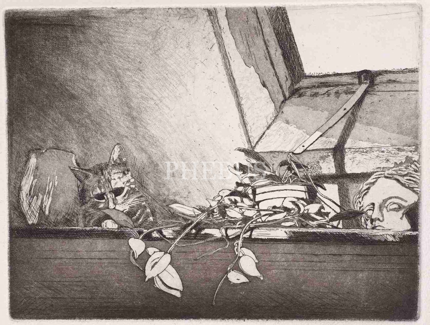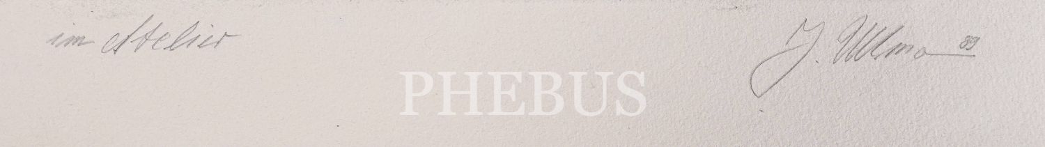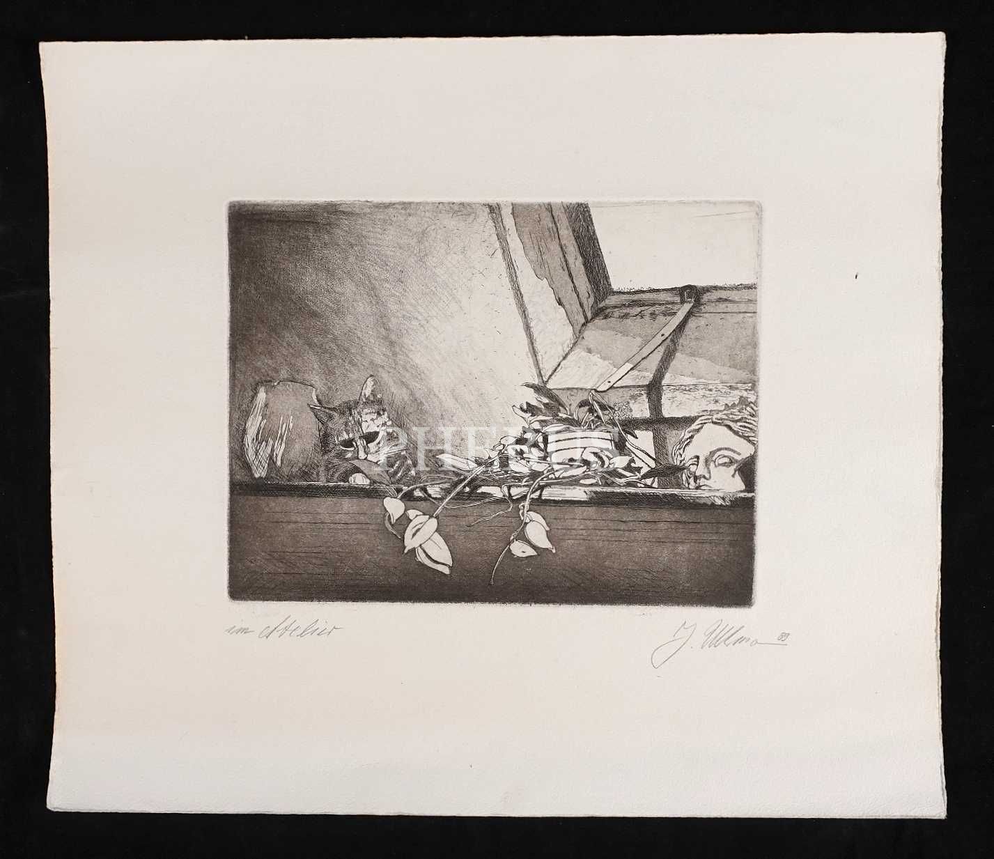 Alman sürrealist sanatçı Jürgen Ullmann imzalı "Im Atelier" konulu baskı, 1989, 35x40 cm
