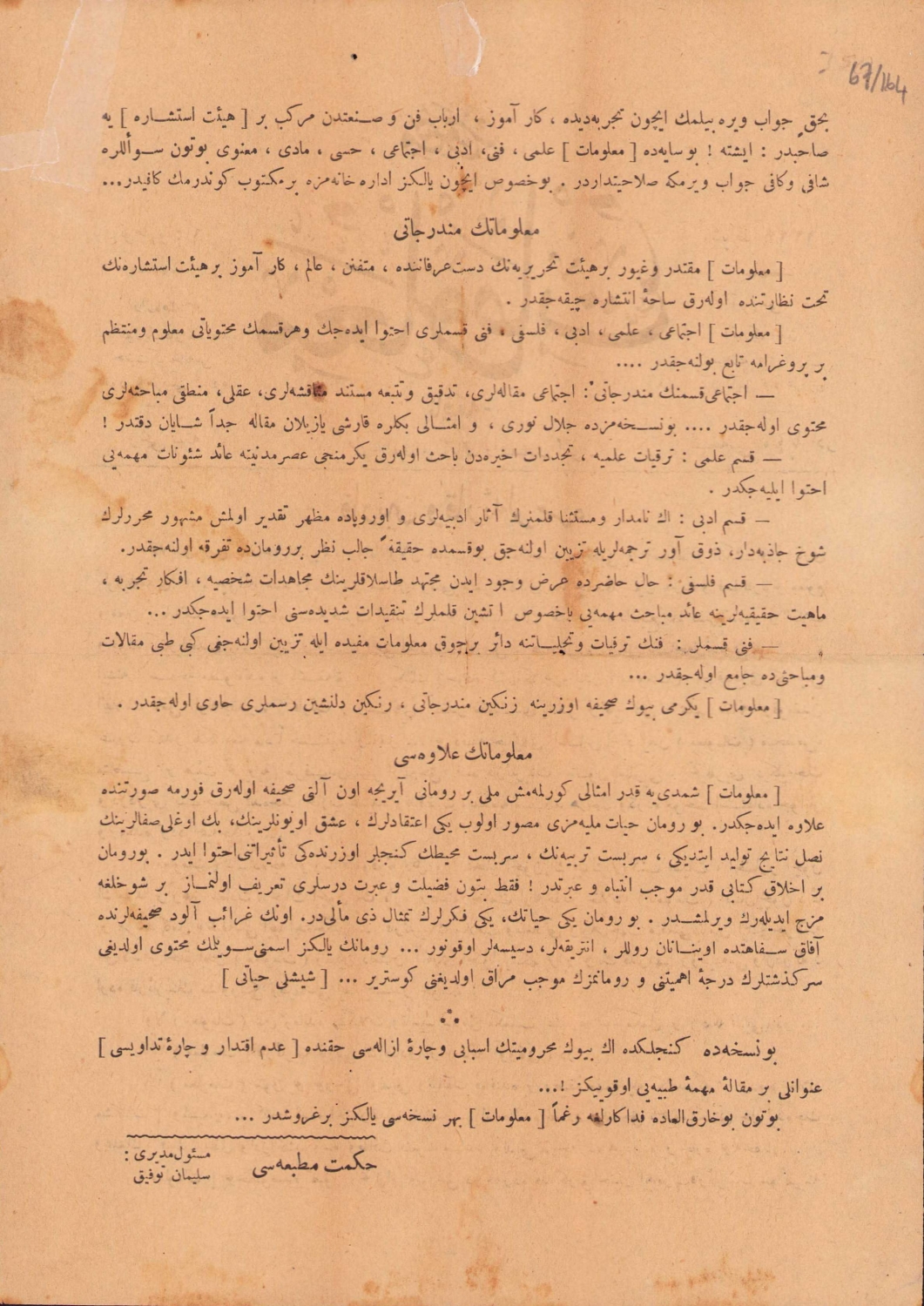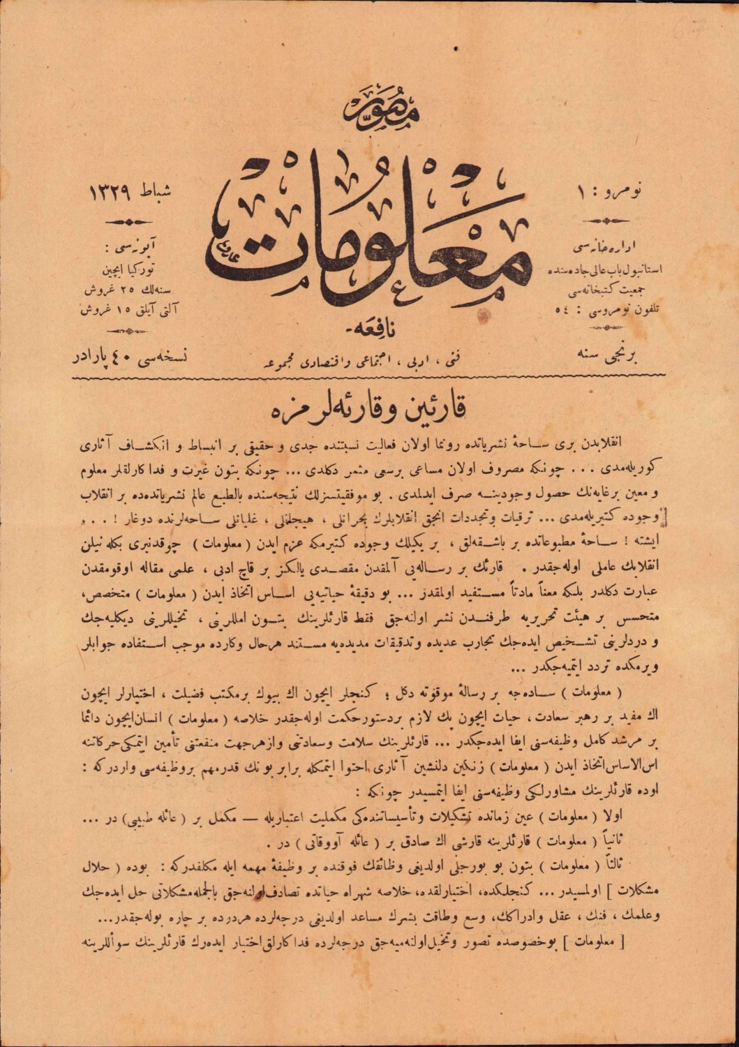 Osmanlıca Musavver Malumat-ı Nafia: “Haftalık fenni, edebi, içtimai ve iktisadi mecmua”dır. 1. sayı, Hikmet Matbaası, mesul müdür Süleyman Tevfik, 20x28 cm