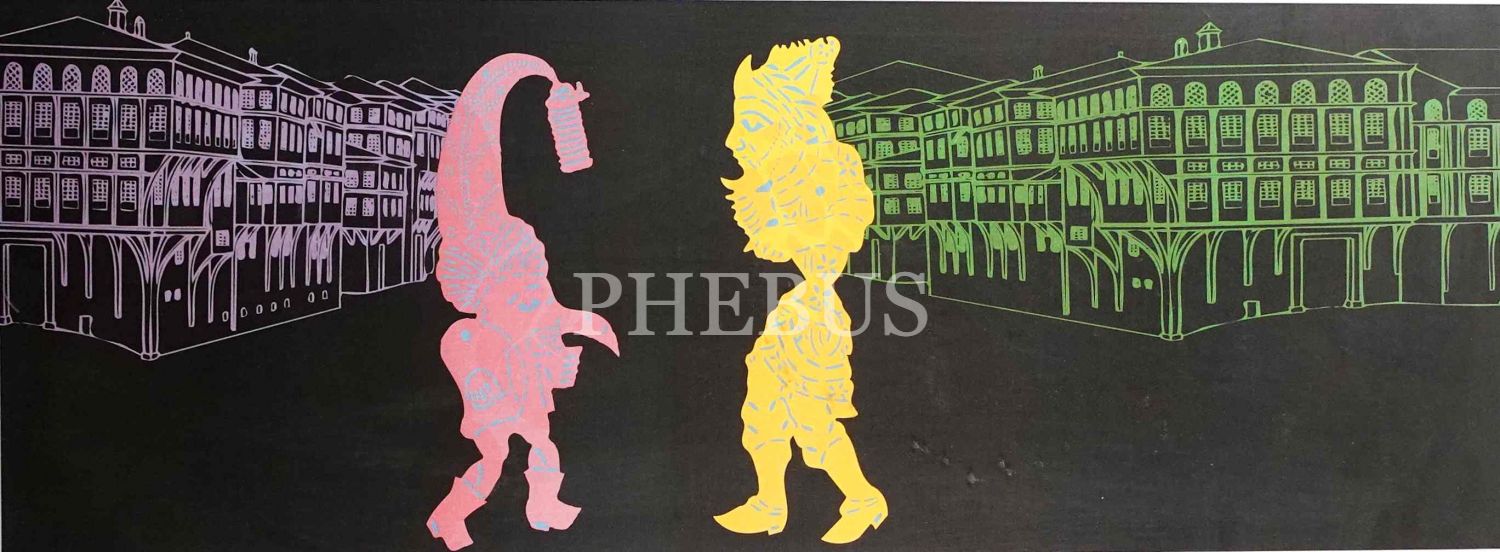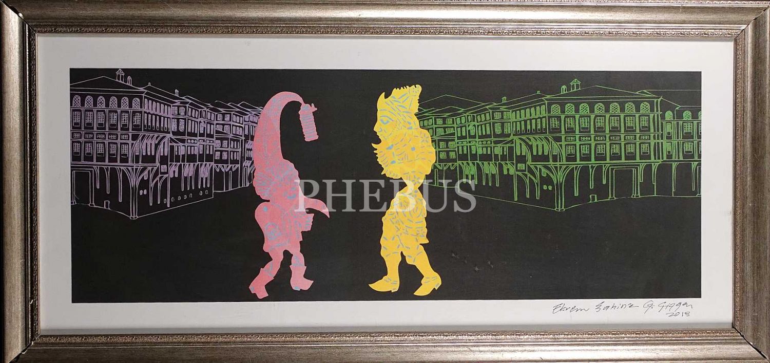 Sanatçı Gültekin Çizgen´den ithaflı ve imzalı, "Karagöz ve Hacivat" konulu özgün baskı, 53x110 cm