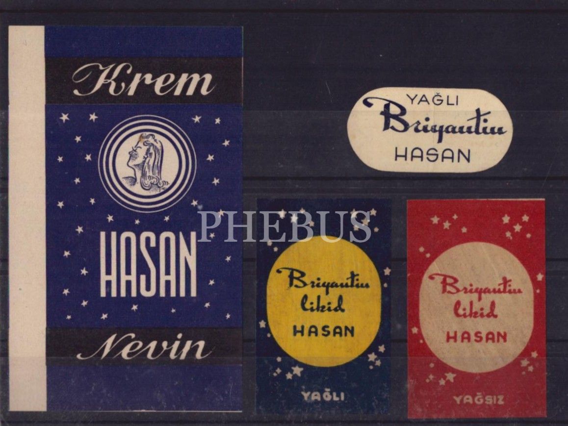 Hasan Itriyat Deposu Dört çeşit Taş Baskı Hasan Krem ve Briyantin Etiketleri