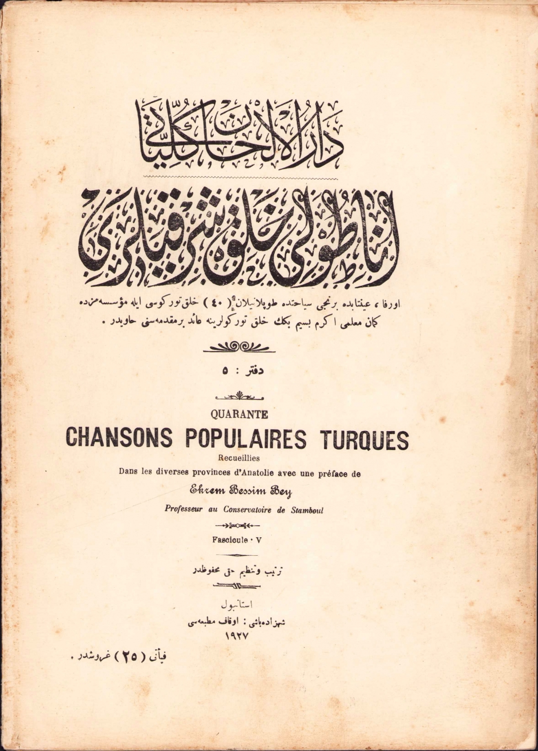 Osmanlıca Darülelhan Külliyatı: Anadolu Şarkıları nota, Evkaf Matbaası, 1927, 24 sayfa, 20x28 cm