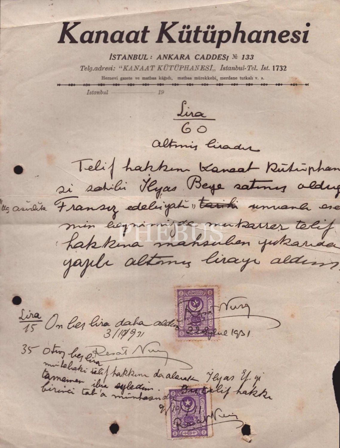 Reşat Nuri Güntekin´in Üç Asırlık Fransız Edebiyatı İsimli Eserinin Telif Haklarını Kanaat Kütüphanesi Sahibi İlyas Beye devri konulu ve Reşat Nuri iki adet ıslak imzalı 1931 tarihli Doküman