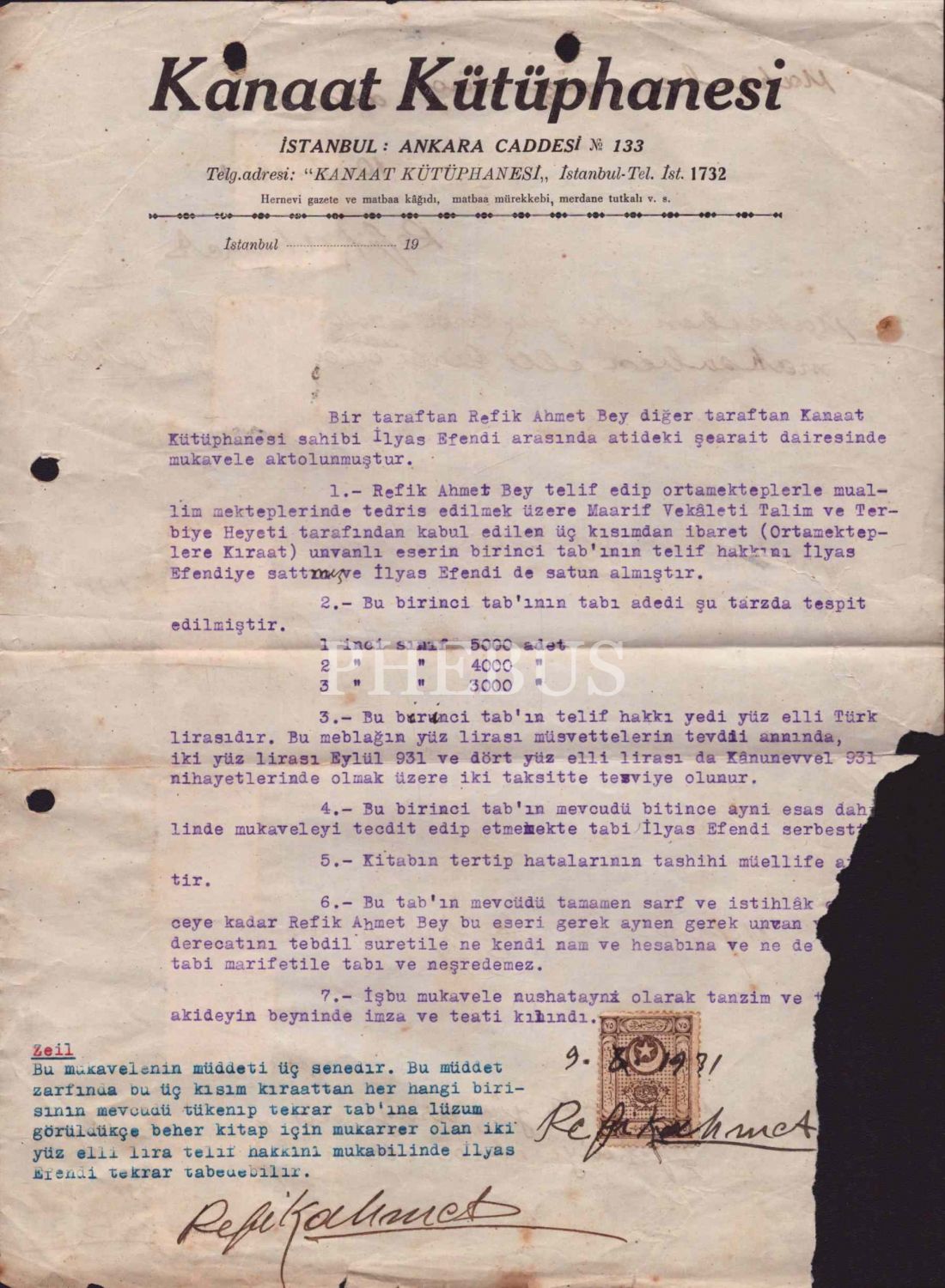 Refik Ahmet Sevengil´in Orta Mekteplere Kıraat İsimli Eserinin Telif Haklarını Kanaat Kütüphanesi Sahibi İlyas Beye devri konulu ve Refik Ahmet Dokuz adet ıslak imzalı 1931 tarihli Doküman
