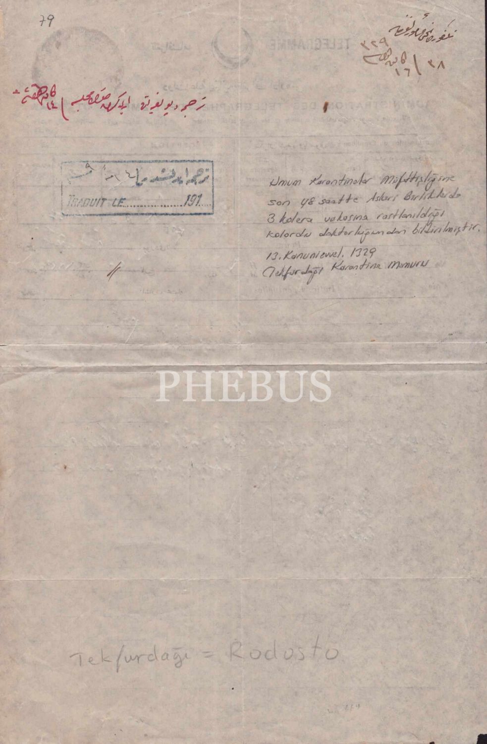Umum Karantinalar Müfettişliğine : Son 24 saatte Askeri Birliklerde 3 Kolera Vakasına Rastlanıldığı Kolordu Tabipliğinden bildirilmiştir.13 Kanunuevvel 1329(1913) Tekfurdağı(Tekirdağ) Karantina Memurluğu Yazılı Telgraf