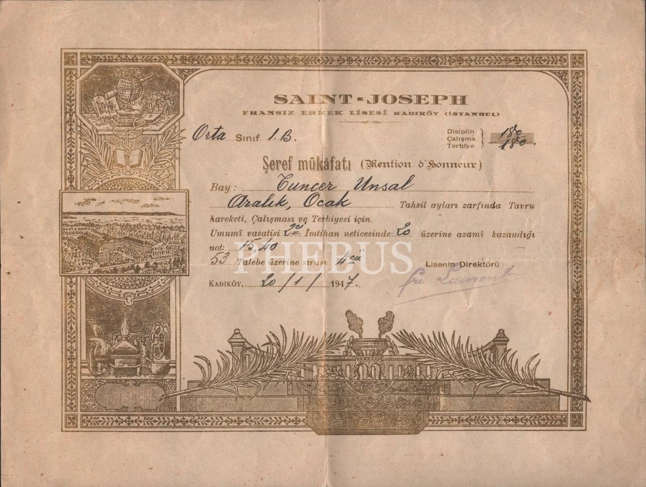Kadıköy Saint Joseph Fransız Erkek Lisesi 1947 Tarihli Altın Varak Baskı Şeref Mükafaatı Belgesi