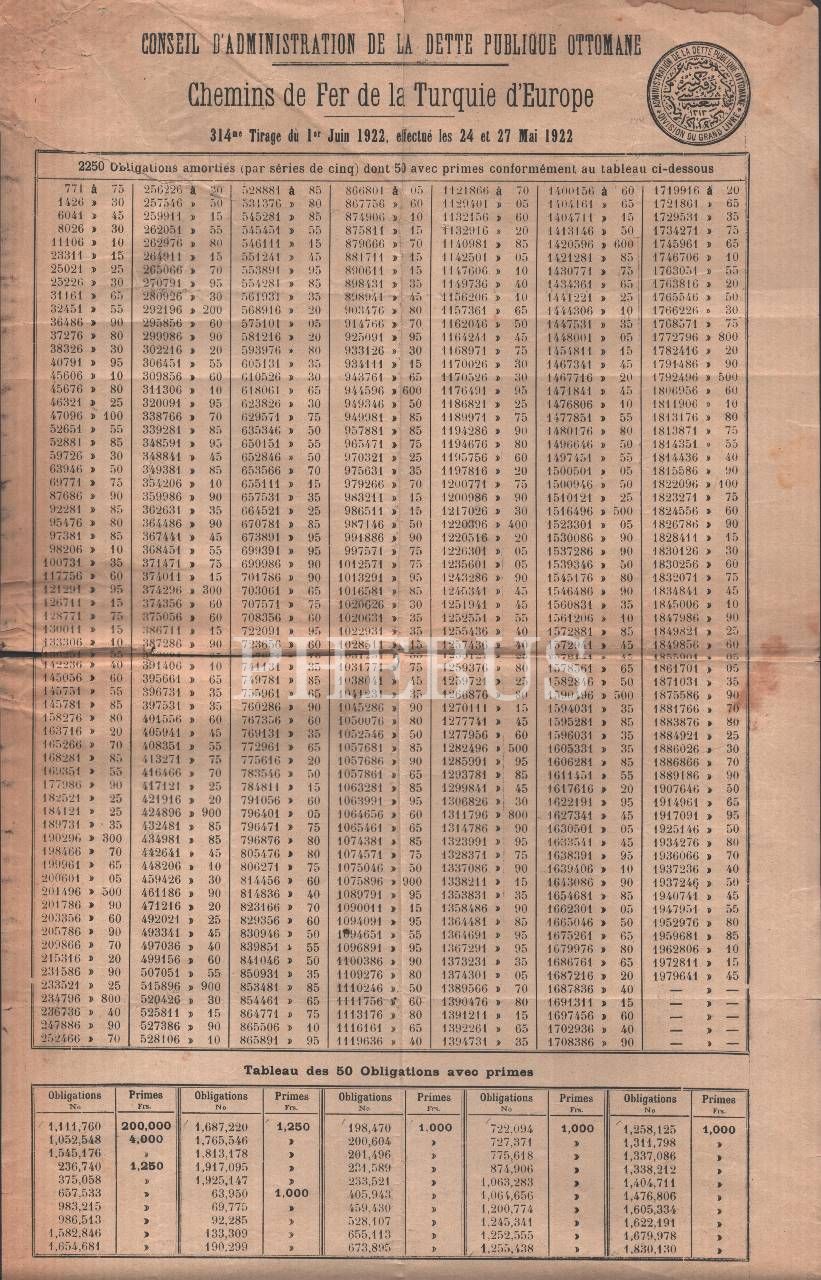 Rumeli Demiryolları 1922 Tarihli İkramiye Çekiliş Listesi