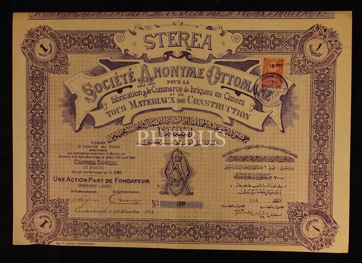 STREA Çimento ve Briket Fabrikaları 1913 tarihli Bir Paylık Kurucu Hisse Senedi