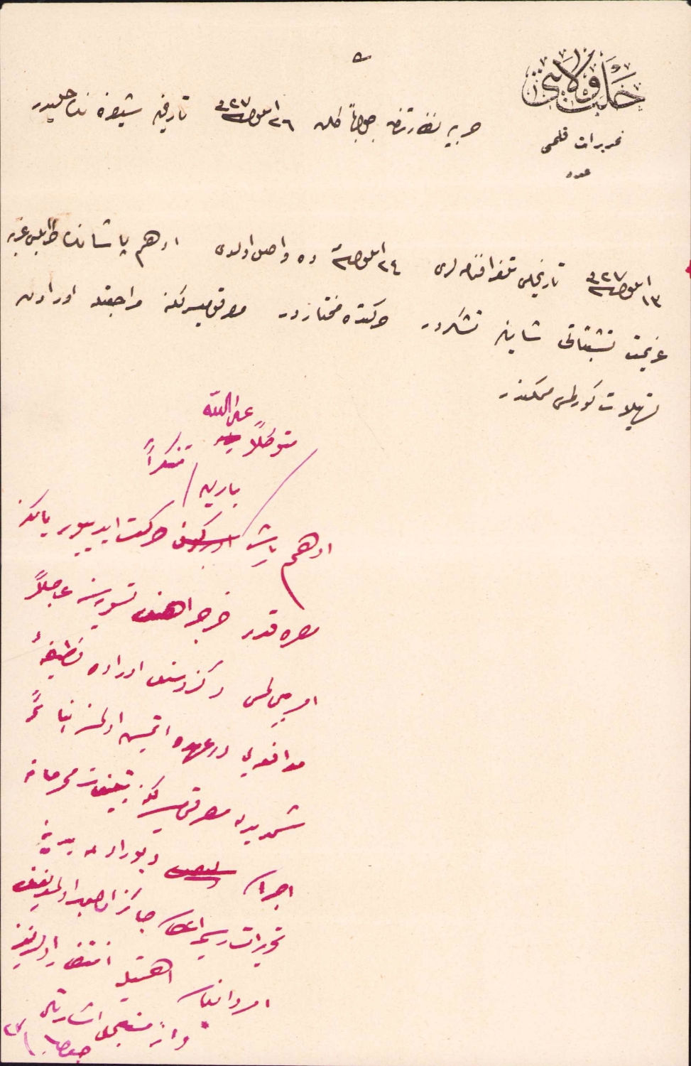 Osmanlı Halep Vilayeti antetli Ethem Paşa'nın Trablusgarp'a azimetine dair evrak, 15x24 cm