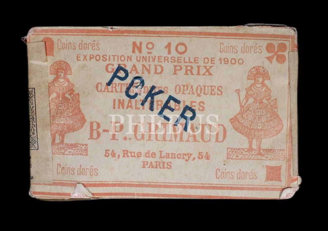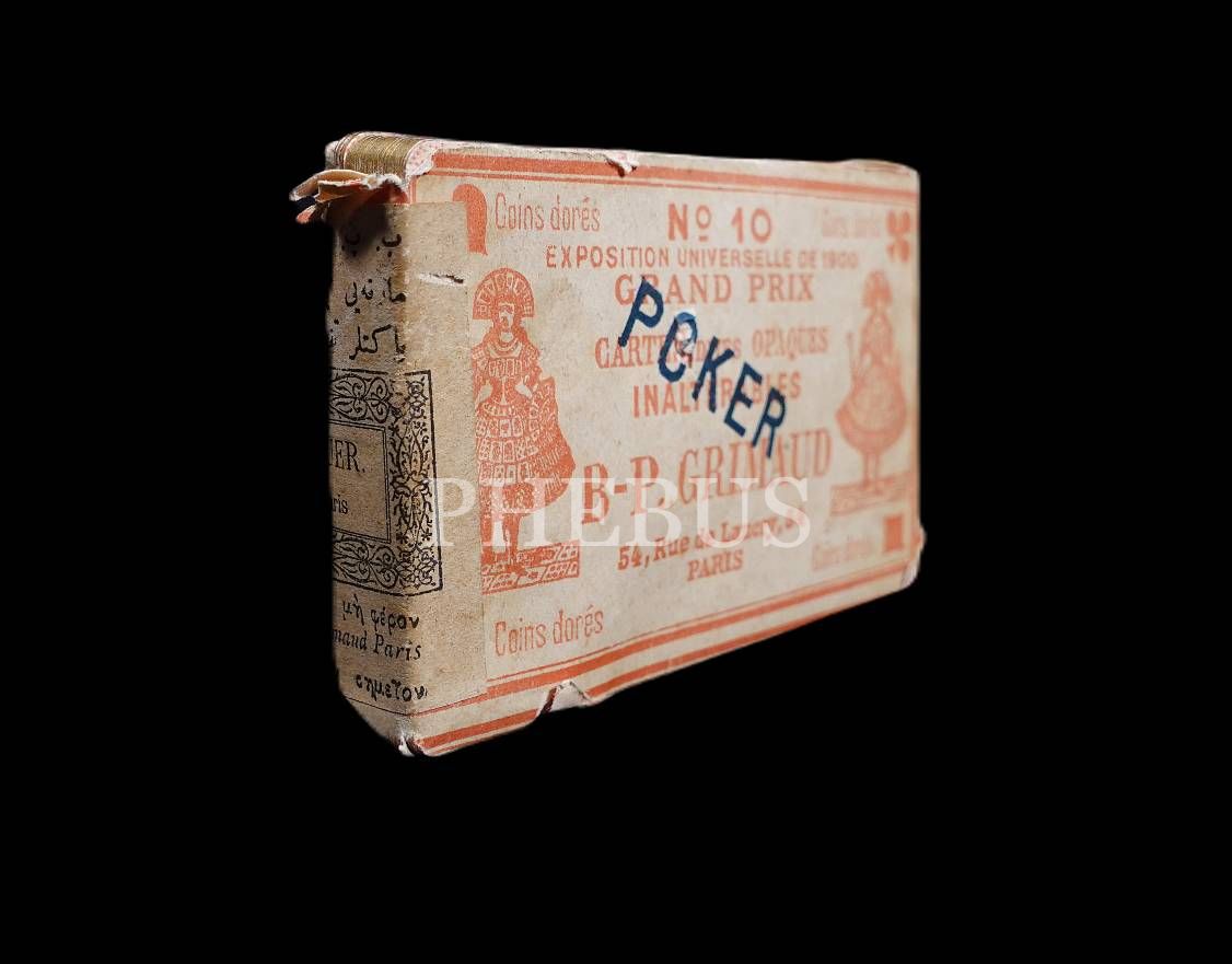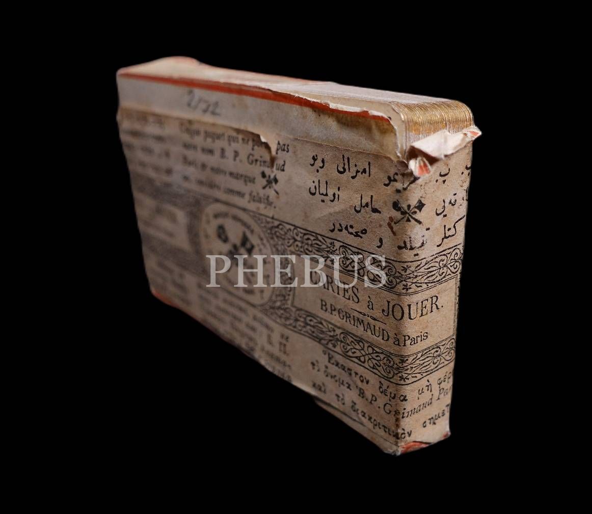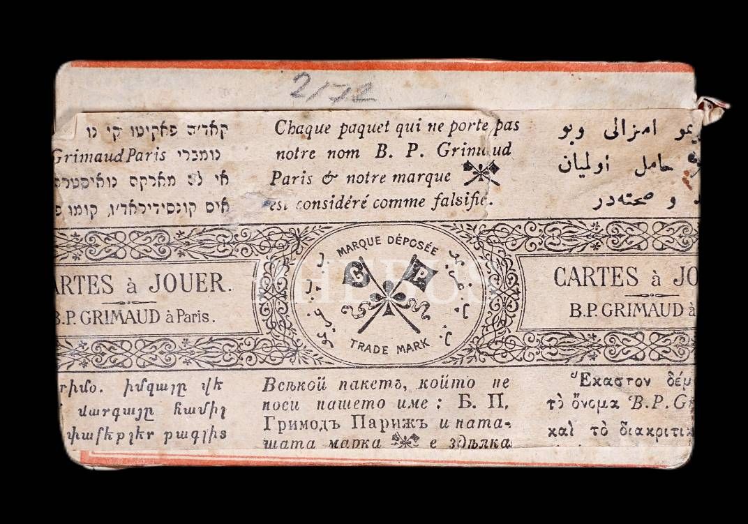 1909 Paris Fuarı´ndan Osmanlıca-Rumca-Ermenice-İbranice(ladino)-Fransızca etiketli açılmamış ambalajı içinde poker kartları, 9x6x1,5 cm