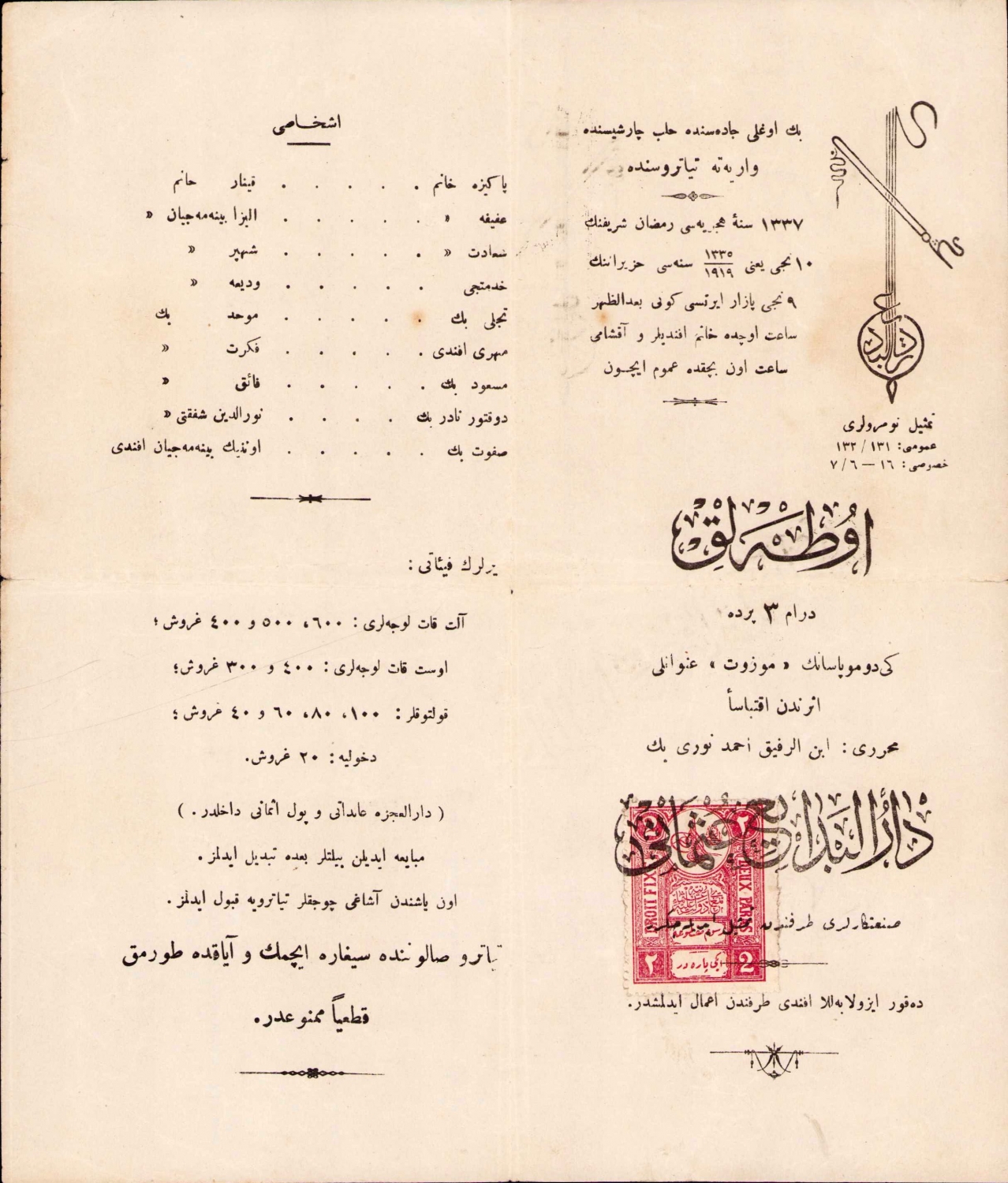 Osmanlı Darülbedayi-i Osmani, Ahmet Refik Nuri Bey'in Odalık tiyatro oyununun tanıtım broşürü, 20x24 cm