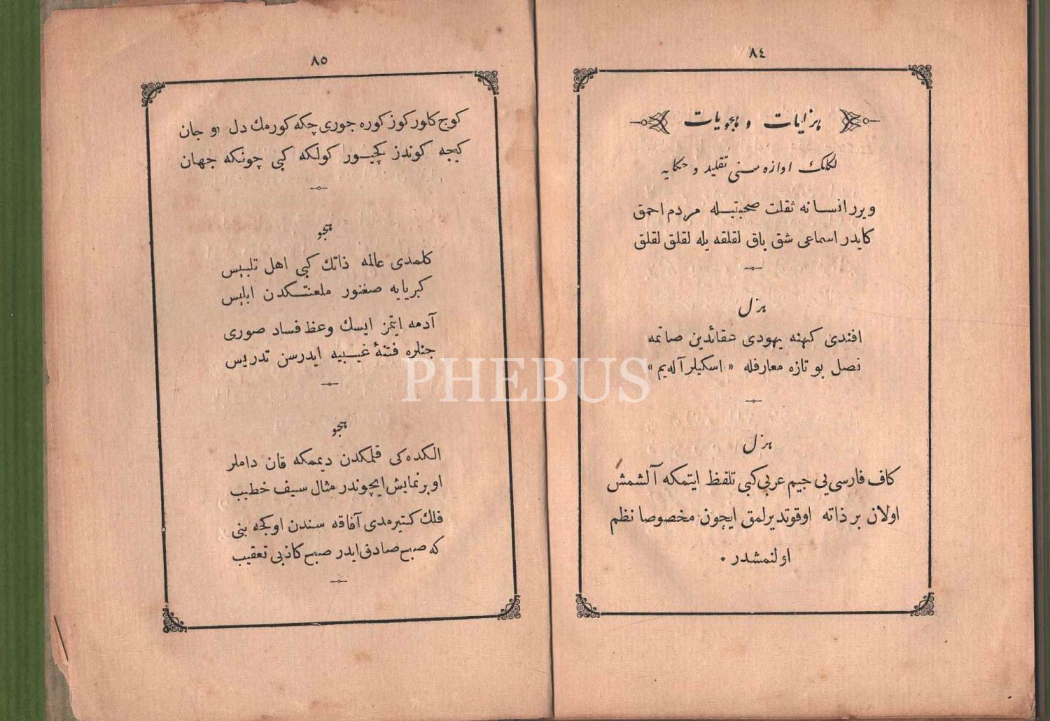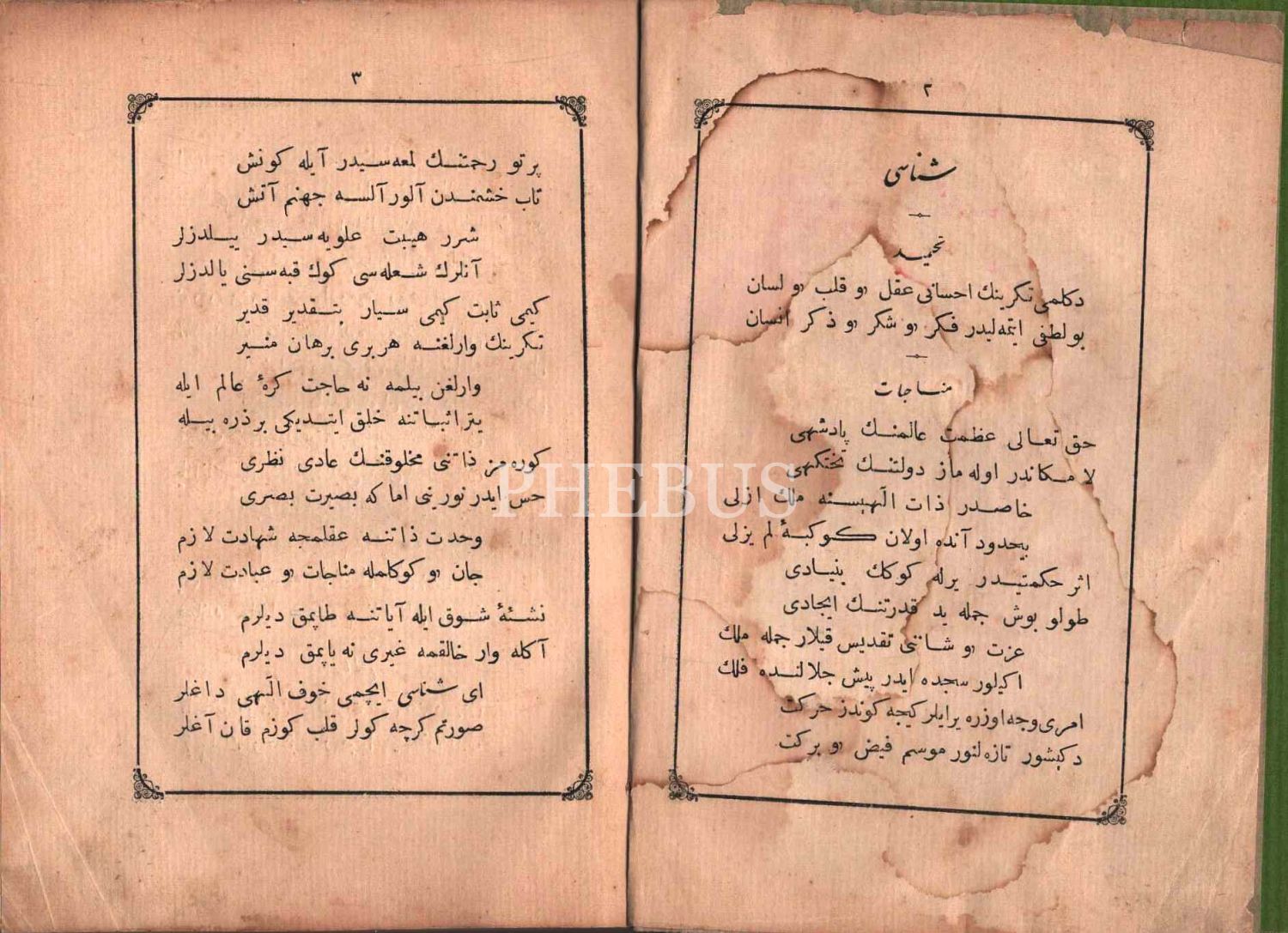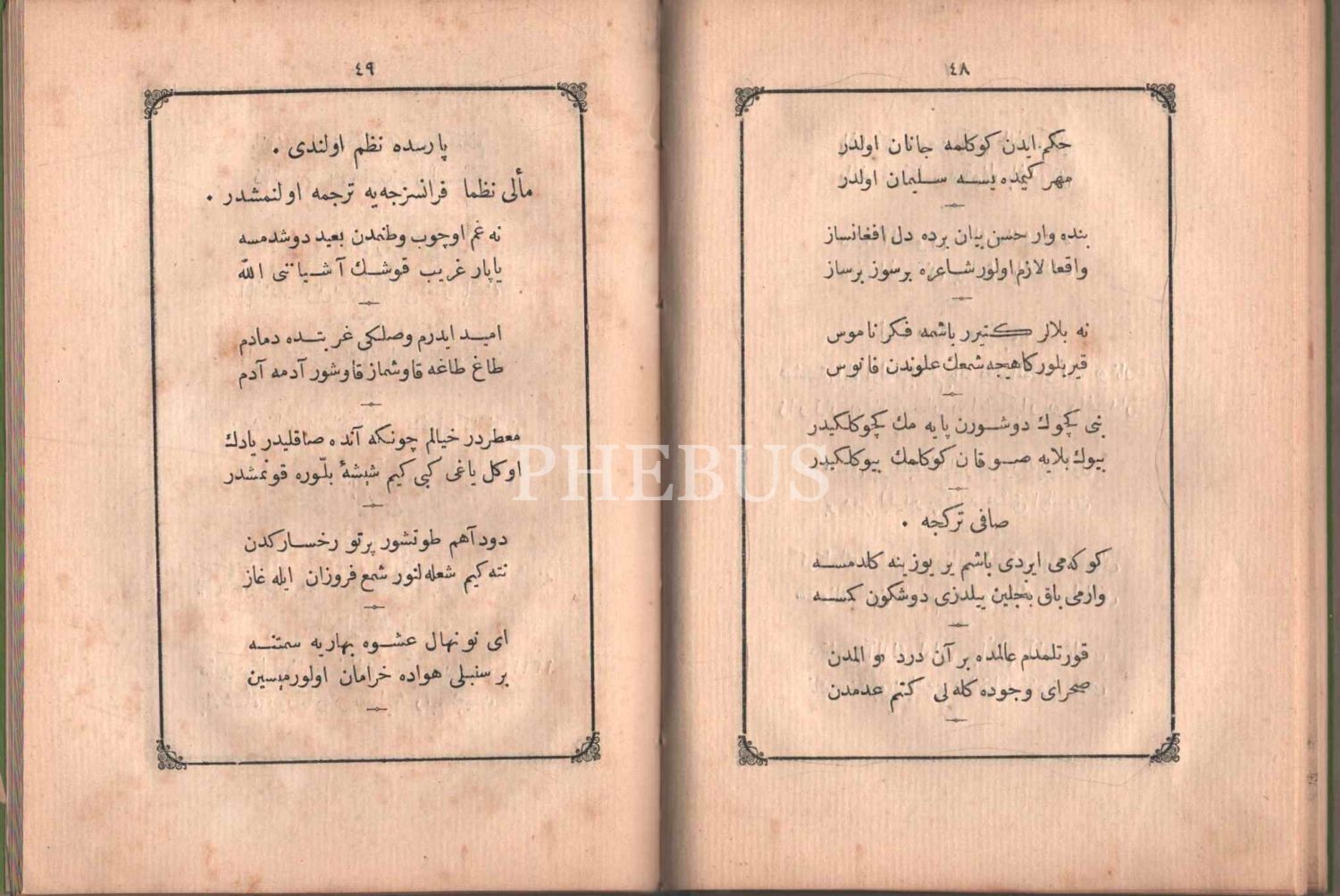 "Müntehabat-ı Eş´ar´ım birinci defa olarak 15 Safer 1279 tarihinde Tasvir-i Efkar gazetehanesinde basılmış idi. İşbu ikinci nüshası ise evvelinden ziyade sahih ve ilaveli olarak yine Tasvir-i Efkar matbaasında tab´ olunmuştur." *Künye sayfası nemden etkilenmiş. Yeni yapılmış, bez cilt içinde...