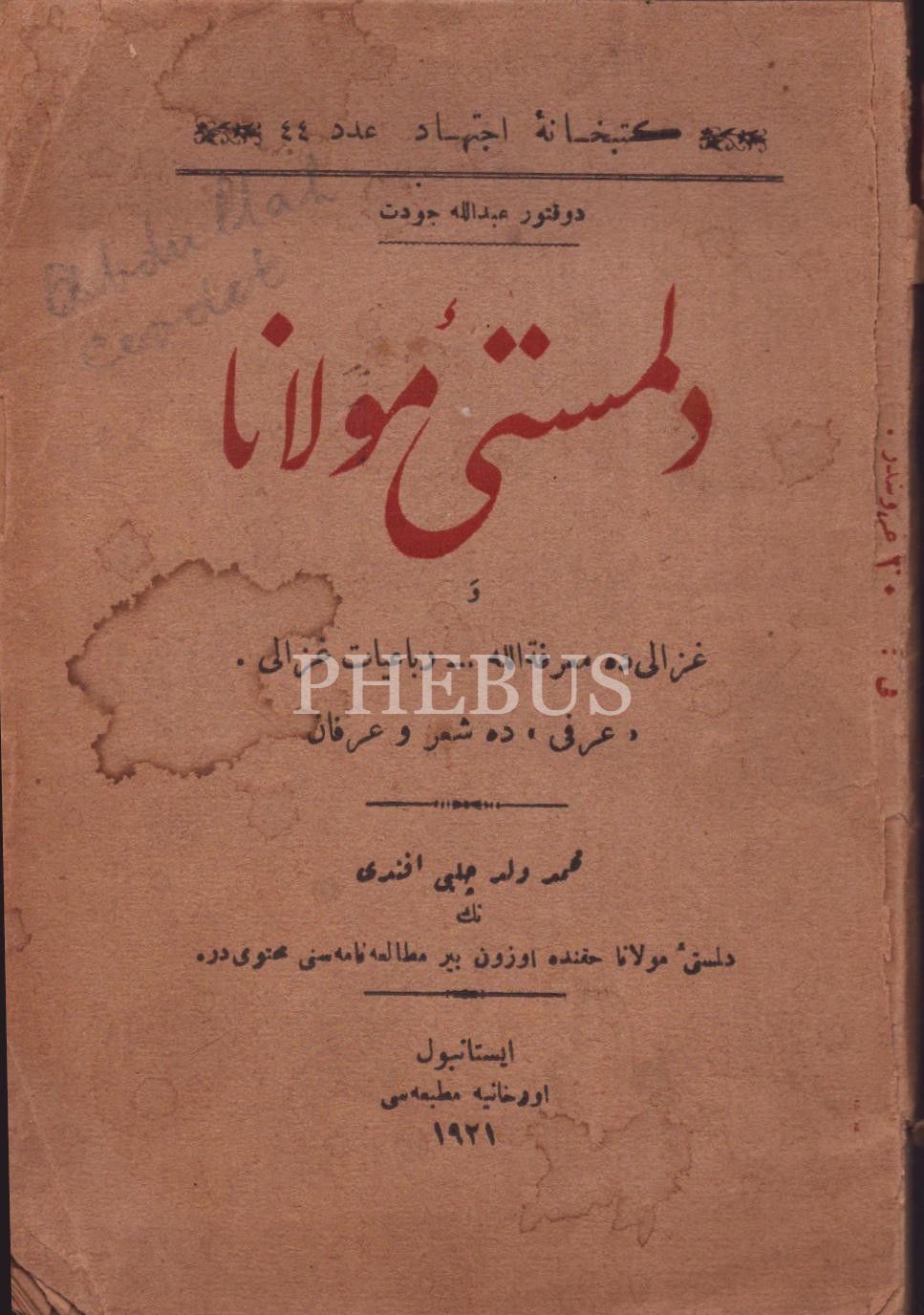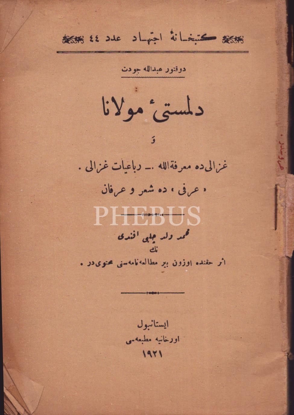 DİLMEST-İ MEVLANA, Abdullah Cevdet, İstanbul 1921, Orhaniye Matbaası, 128 sayfa, 13x18 cm...