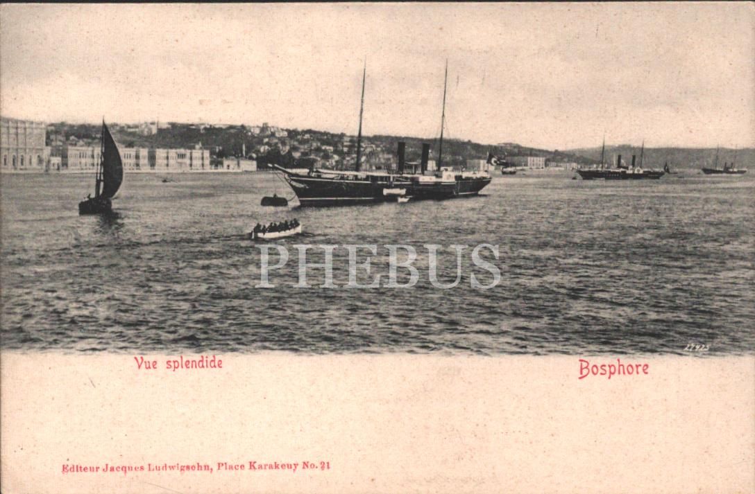 Boğaziçi´nde süzülen deniz taşıtları, "Vue splendide - Bosphore", ed. Jacques Ludwigsohn, Place Karakeuy No. 21, 14x9 cm...