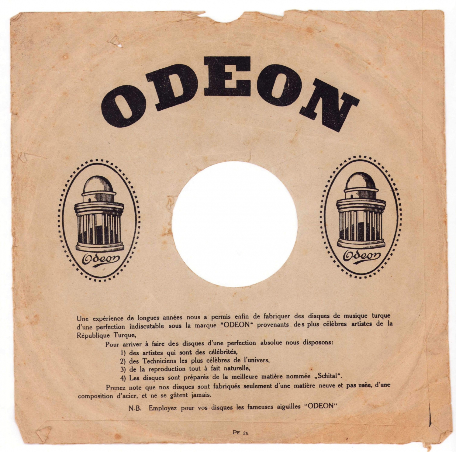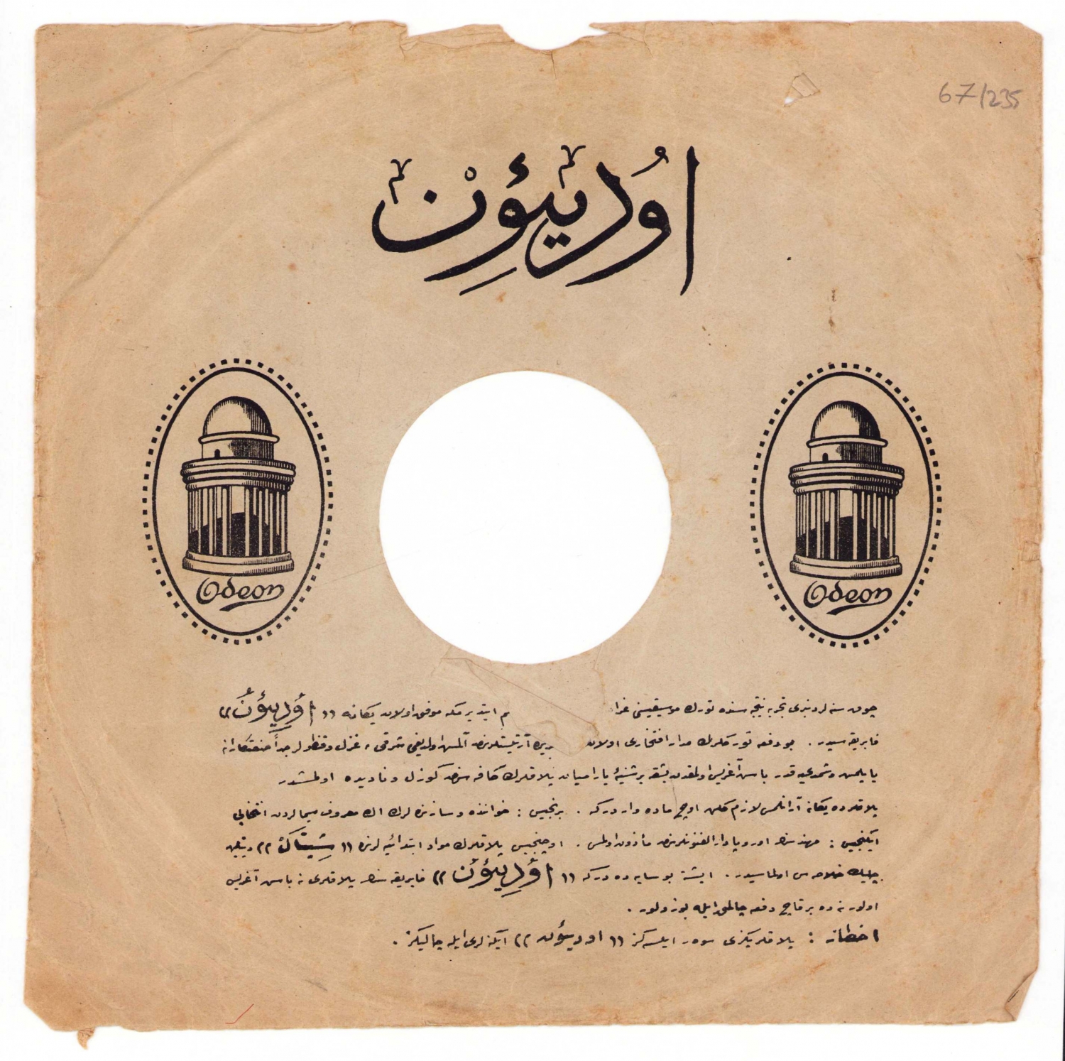 Osmanlıca - Fransızca Odeon taş plak zarfı