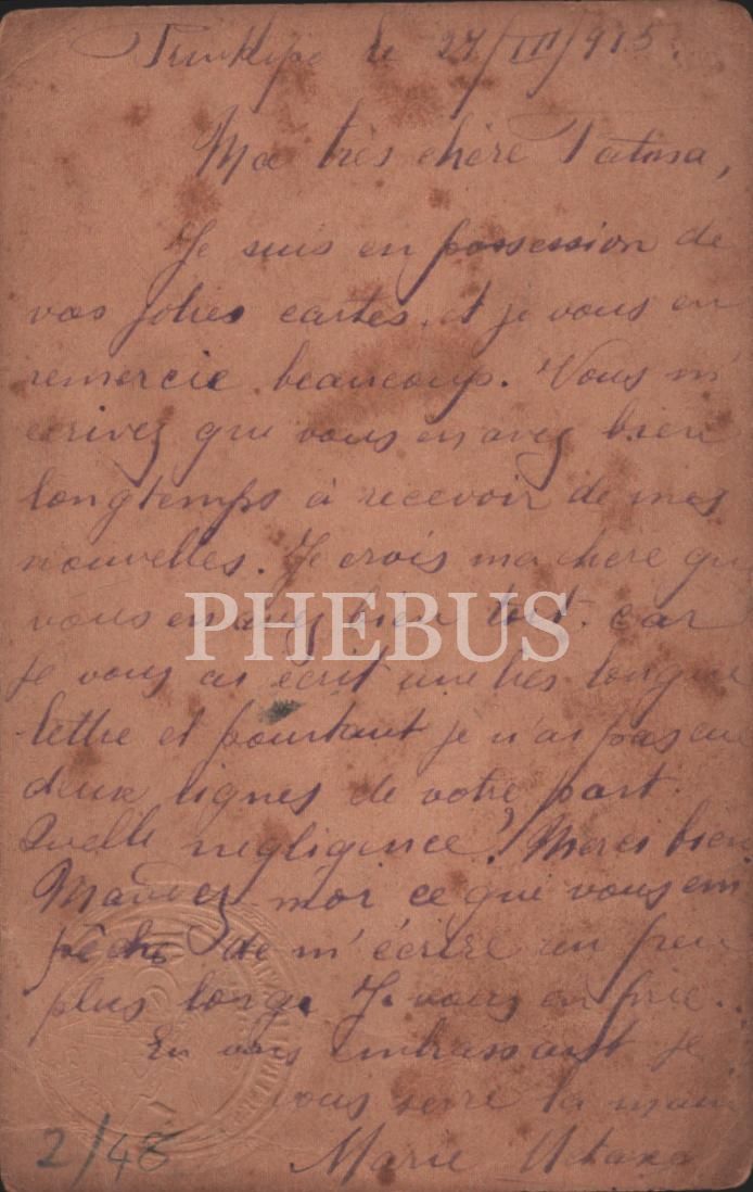 Ön yüzünde "Erenköy´de Caddebostan civarında Şemseddin Paşa´nın köşkünde Mustafa Paşa´nın mahdumu Şevket Bey´in biraderzadeleri Fatma Hanım´a aittir." yazılıdır, arka yüzünde Fransızca Fatma Hanım´a hitaben yazılmış mektup vardır.