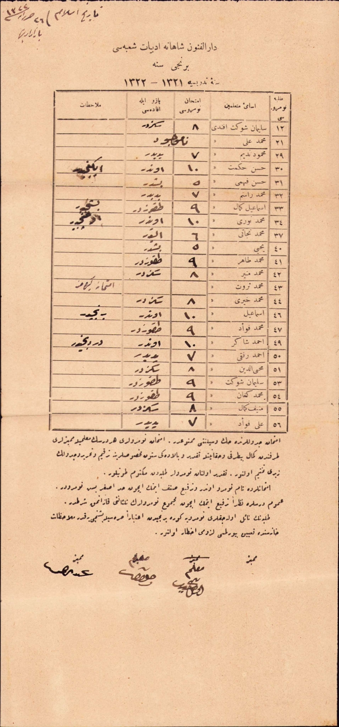 Osmanlı Darülfünun Şahane Edebiyat şubesi birinci seneye ait 1322 - 1321 ders yılı talebe listesi,17x38 cm