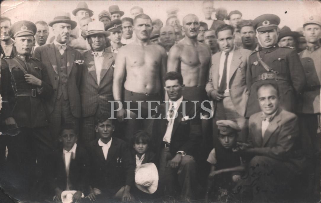Selahattin Gedik, yağlı güreş etkinliğinde pehlivanlarla birlikle, 9 Eylül 1937, 14x9 cm...