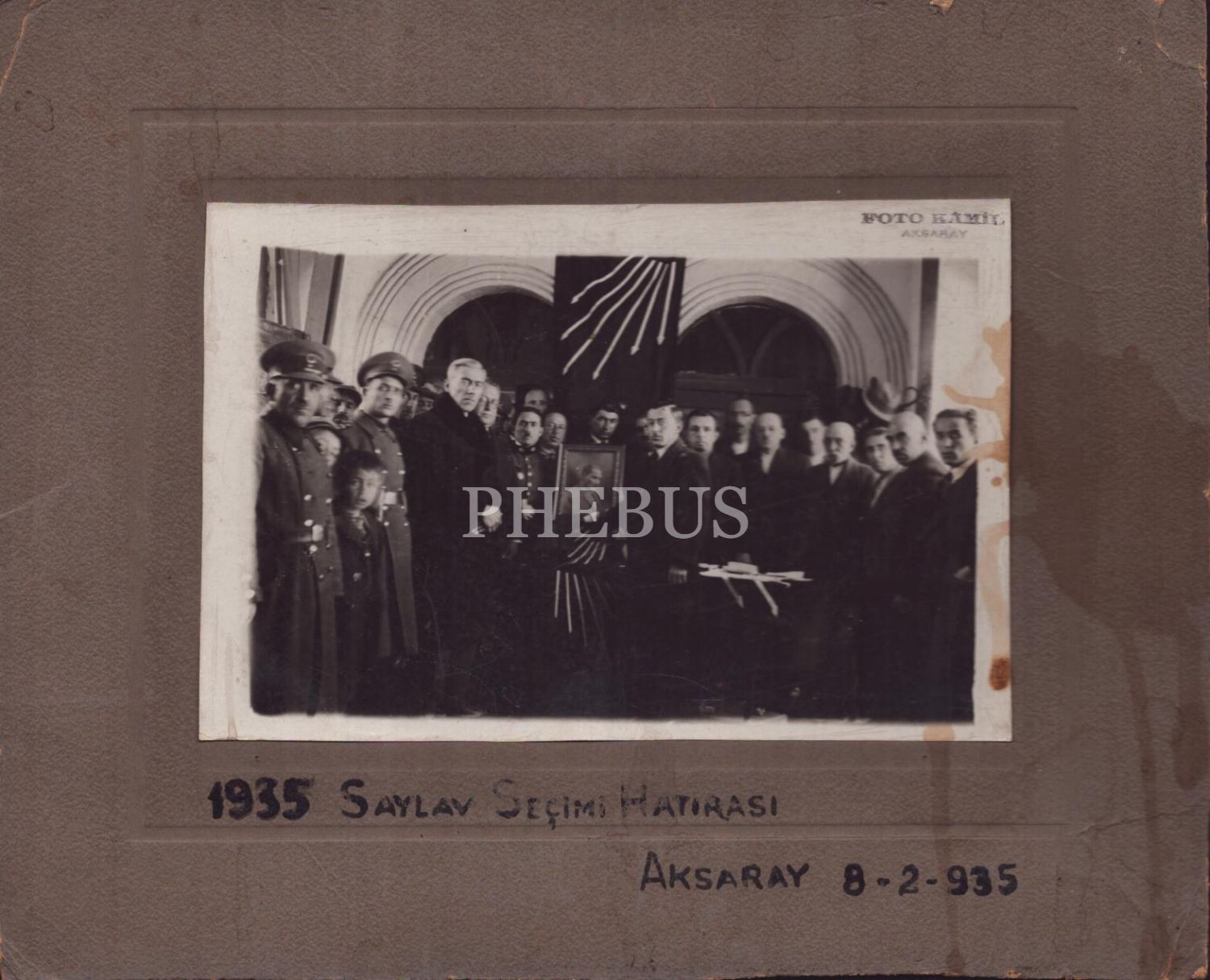 Aksaray Kaymakamı Selahattin Gedik´in katılımıyla "1935 Saylav Seçimi Hatırası", 8 Şubat 1935, "Foto Kâmil - Aksaray" damgalı, 27x22 cm...