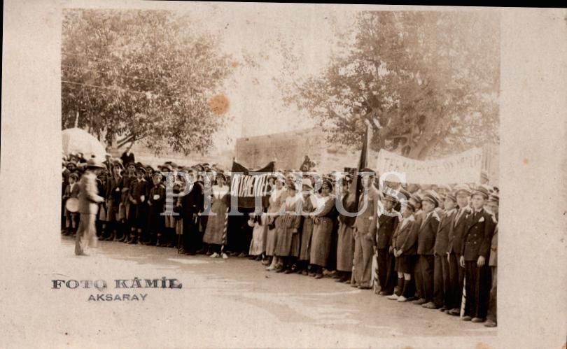 Bir millî bayramda tören için meydana toplanan Aksaraylı talebeler, "Foto Kâmil - Aksaray" damgalı, 14x9 cm...