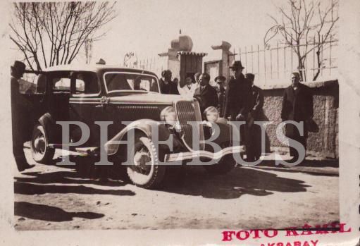 Selahattin Gedik ve beraberindekiler makam aracının yanında, "Foto Kâmil - Aksaray" damgalı, 9x6 cm...