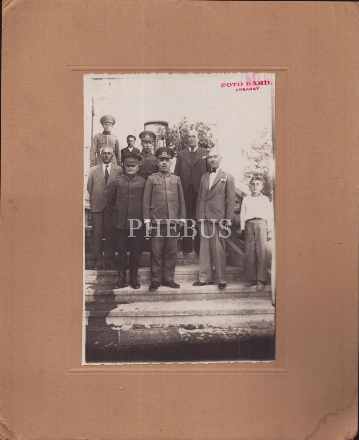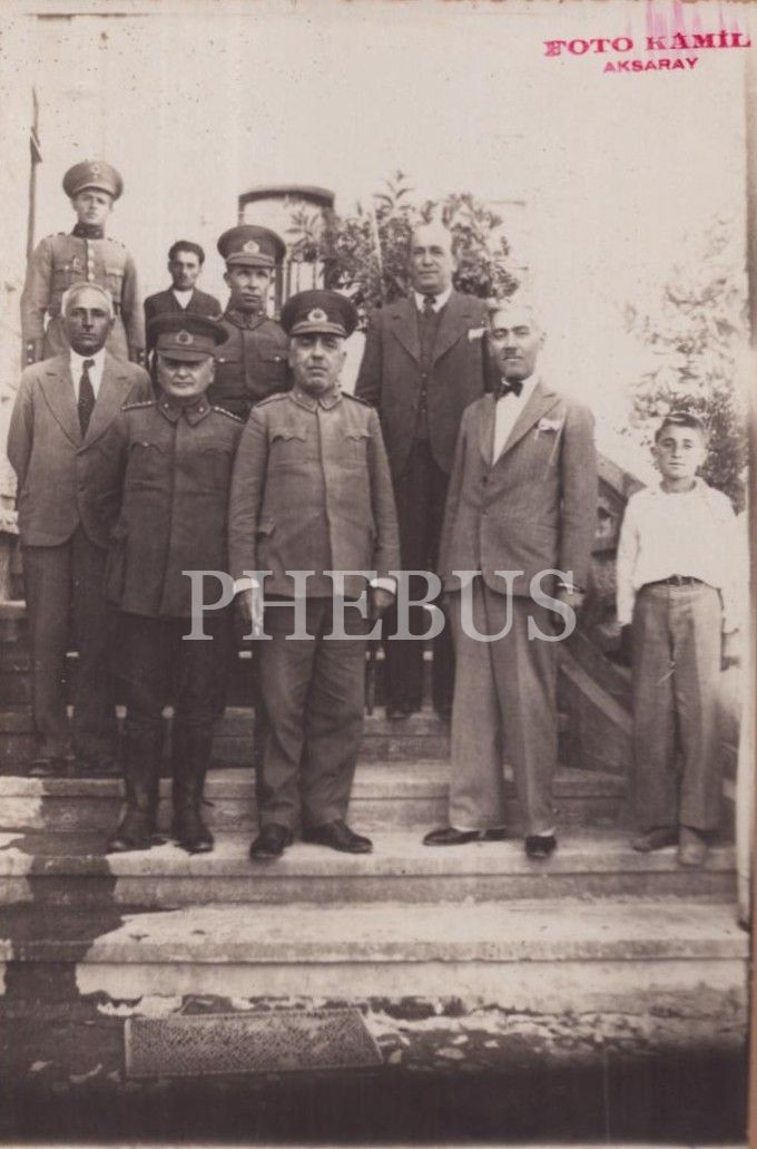 Selahattin Gedik, askeri ve sivil memurlar ile birlikte kamu binası önünde, "Foto Kâmil - Aksaray" damgalı, 22x27 cm...