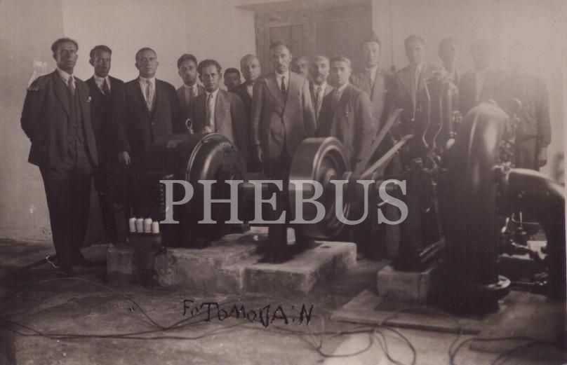 Bir sanayi makinasının çevresinde hatıra fotoğrafı çektiren beyefendiler, "Foto Moda" imzalı, 14x9 cm...