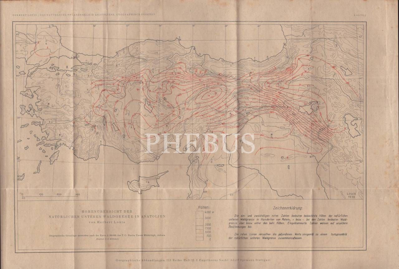 Herbert Louis tarafından hazırlanan "Anadolu´daki Doğal Alt Orman Sınırının Yükseklik Araştırması" üzerine 1:800000 ölçekli Almanca harita,